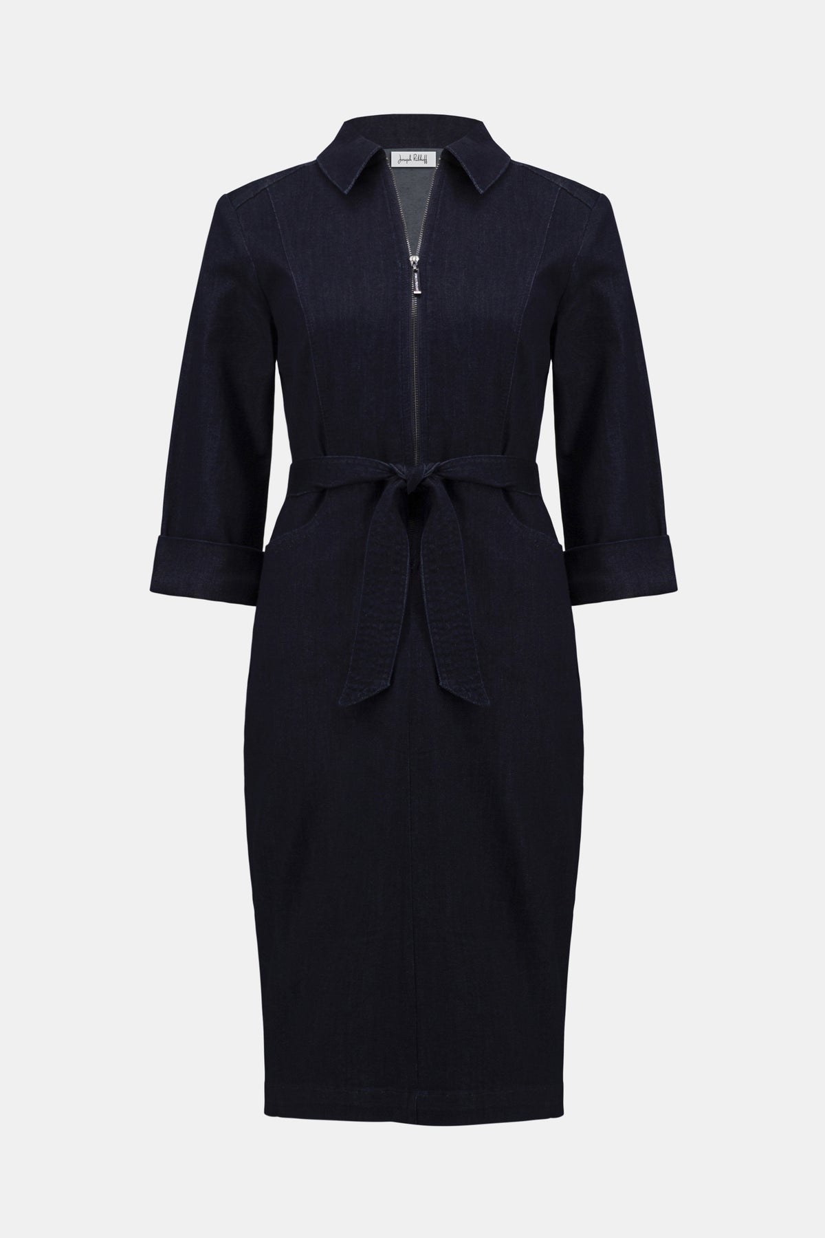 Elevate your everyday style with this Joseph Ribkoff denim dress. The half zip neckline and self belt create a polished look, while the lightweight Featherweave™ fabric—a soft modal blend—moves with you all day. Three quarter sleeves offer the perfect balance of coverage and ease.