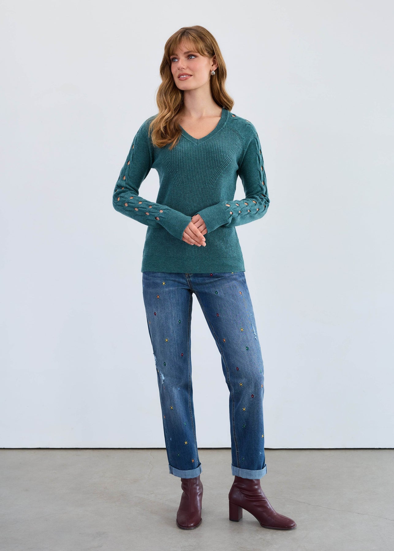 Elevate your wardrobe with this Long Sleeve V-Neck Sweater, designed for both comfort and style. Featuring open stitch sleeves, it offers a unique, breathable texture that keeps you cozy without overheating. The flattering V-neckline adds a touch of elegance, making it perfect for layering or wearing on its own. Whether you're dressing up for a casual outing or relaxing at home, this sweater combines softness and sophistication effortlessly. Experience versatile fashion that moves with you and enhances your everyday look.