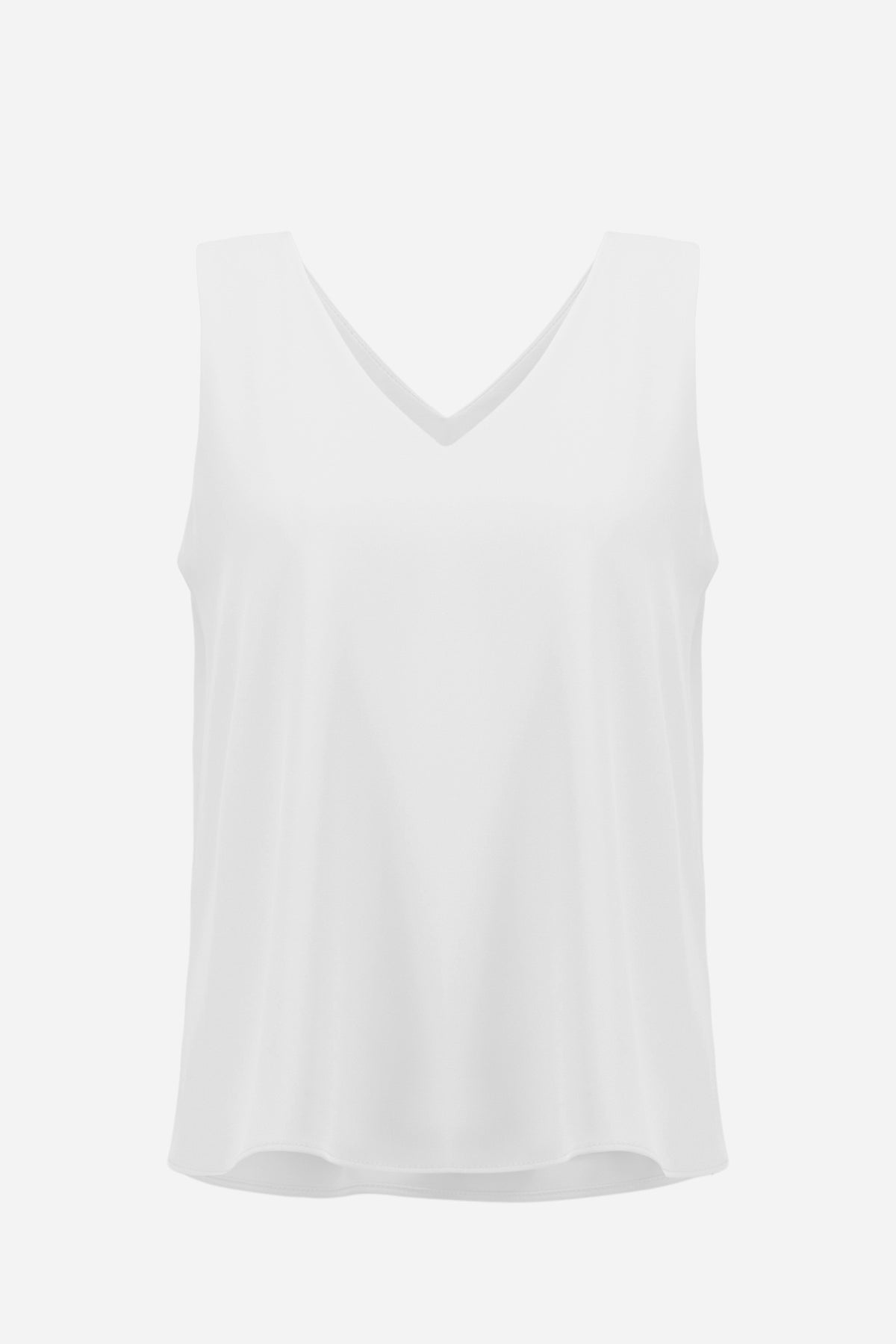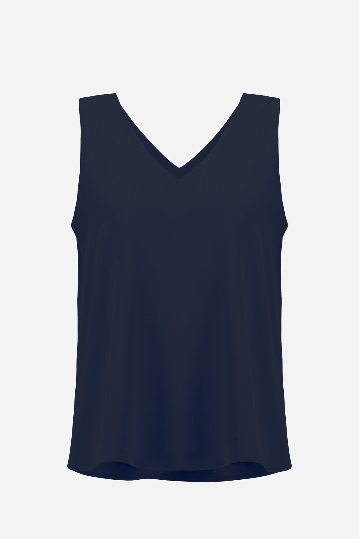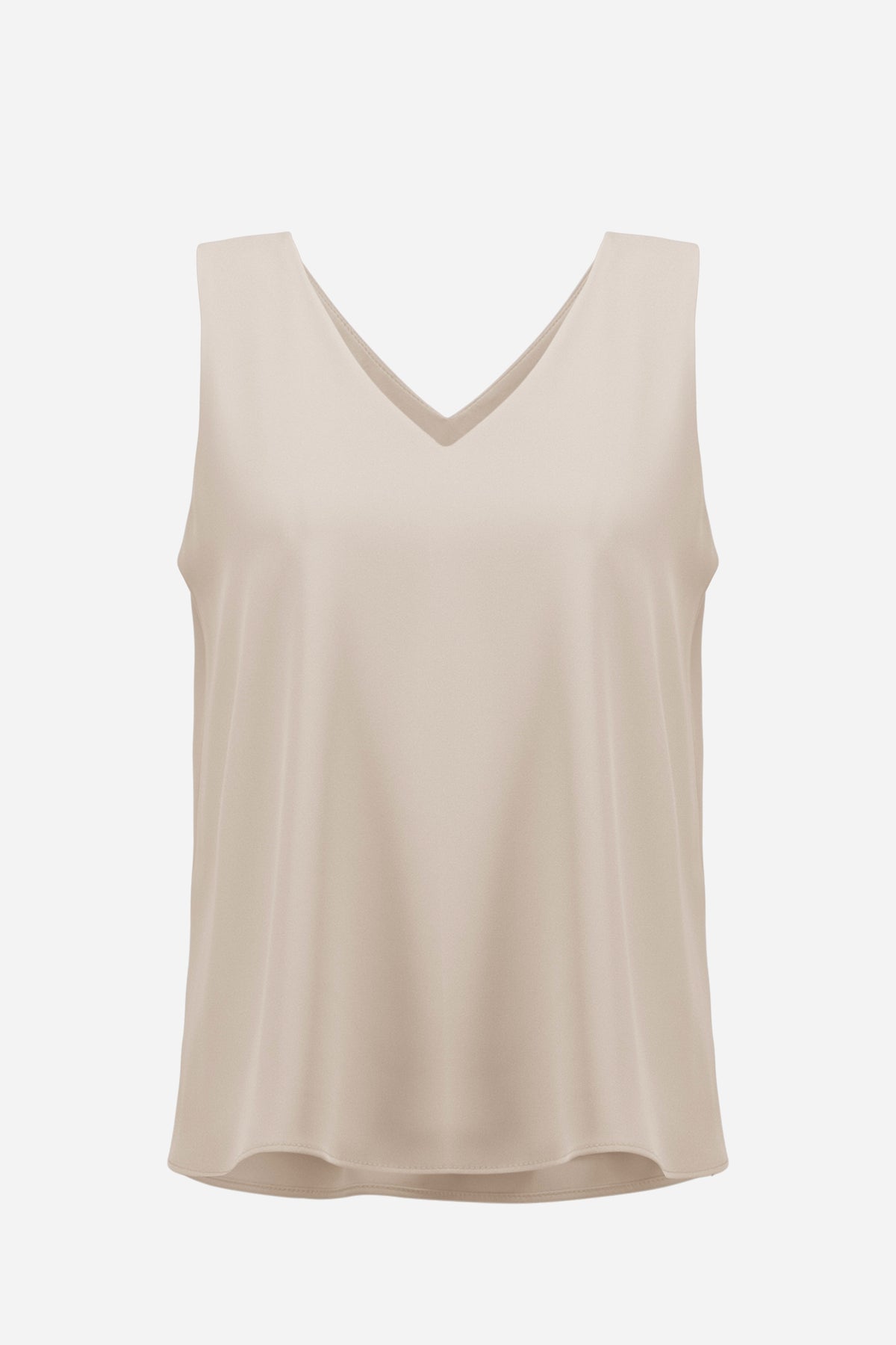 Elevate your wardrobe with this sophisticated woven twill top, designed for effortless elegance. The flattering V-neckline and sleeveless silhouette create a refined look that transitions seamlessly from office to evening. Fully lined construction ensures a smooth, polished appearance while the straight-cut design offers comfortable, versatile styling. Pair it with the Bouclé Fitted Blazer With Notched Collar 261101 for a complete, professional ensemble.