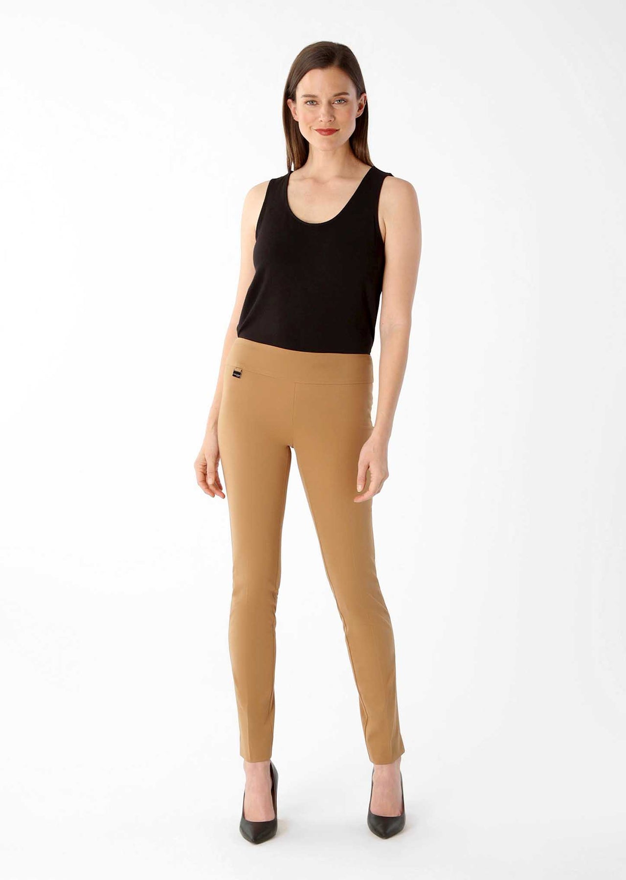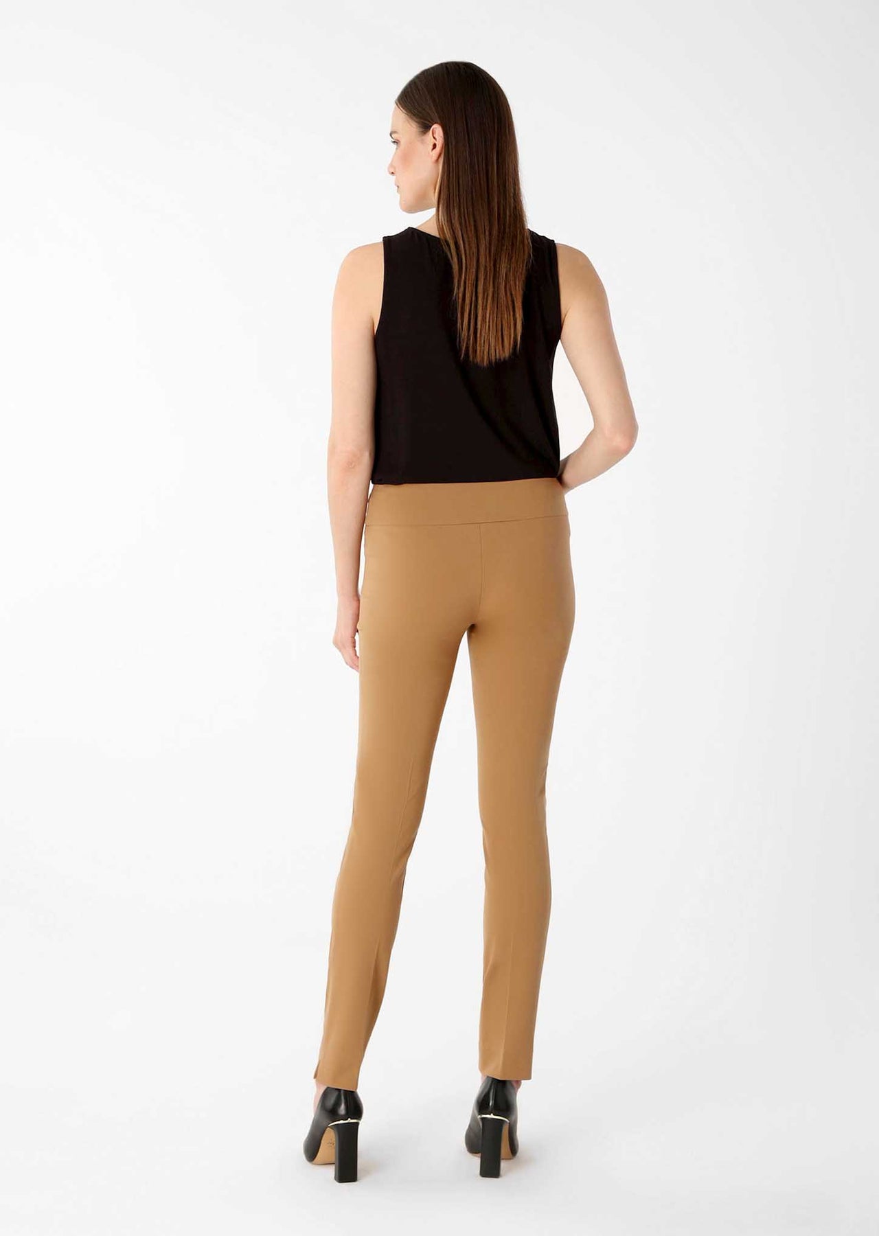I own these pants in multiple styles and colours. Flattering around the hips amd waist, no zippers to bend and bulge. I was thrilled to find the Ivory colour in my size. I usually wear the shorter inseam, but these longer pants have a perfect hem for heels that can be flipped under to wear with flats.