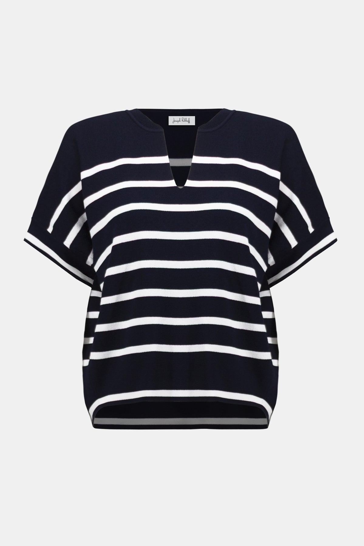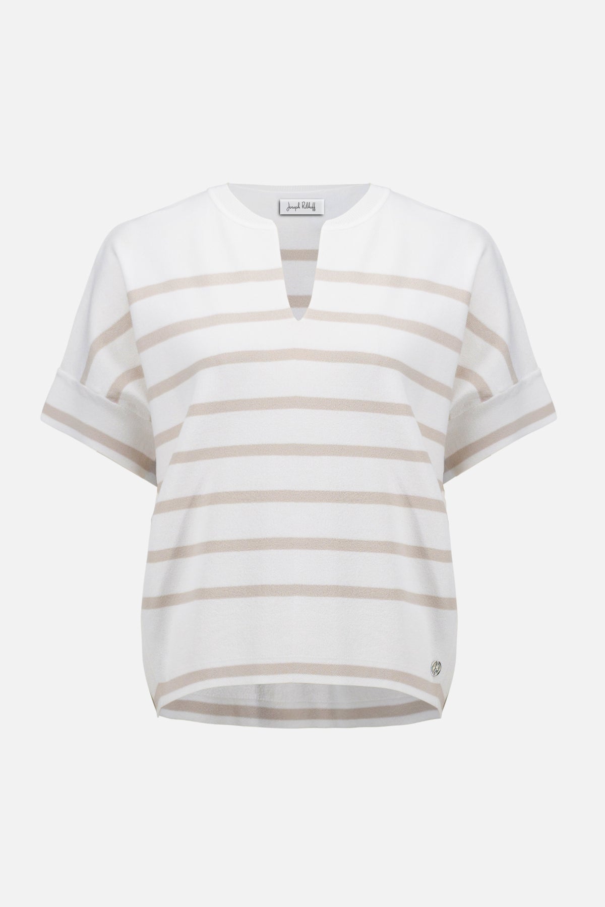 This striped sweater, crafted from dry viscose and nylon, features a relaxed high-low hem and a notched V-neckline. Its short dolman sleeves and boxy silhouette make it an easy, casual piece for any occasion.