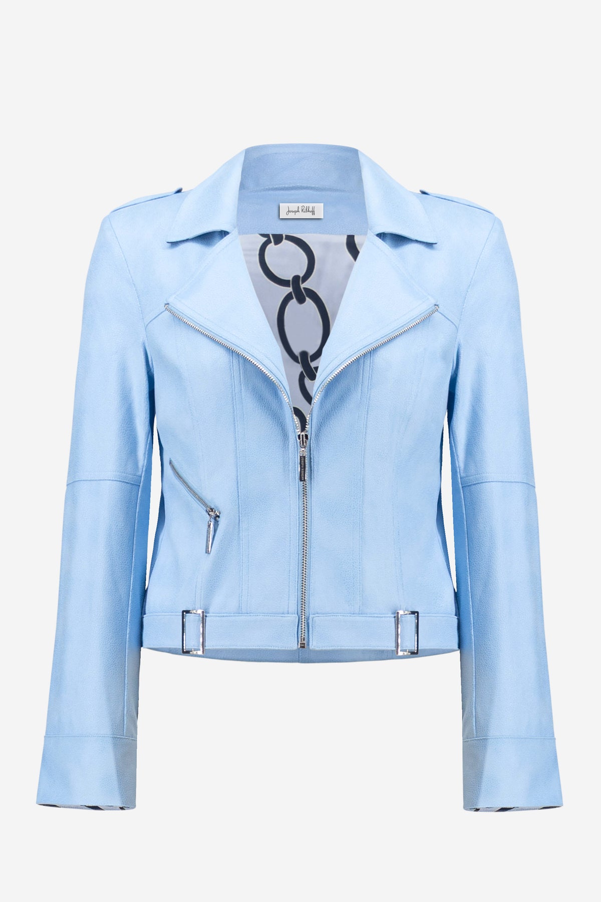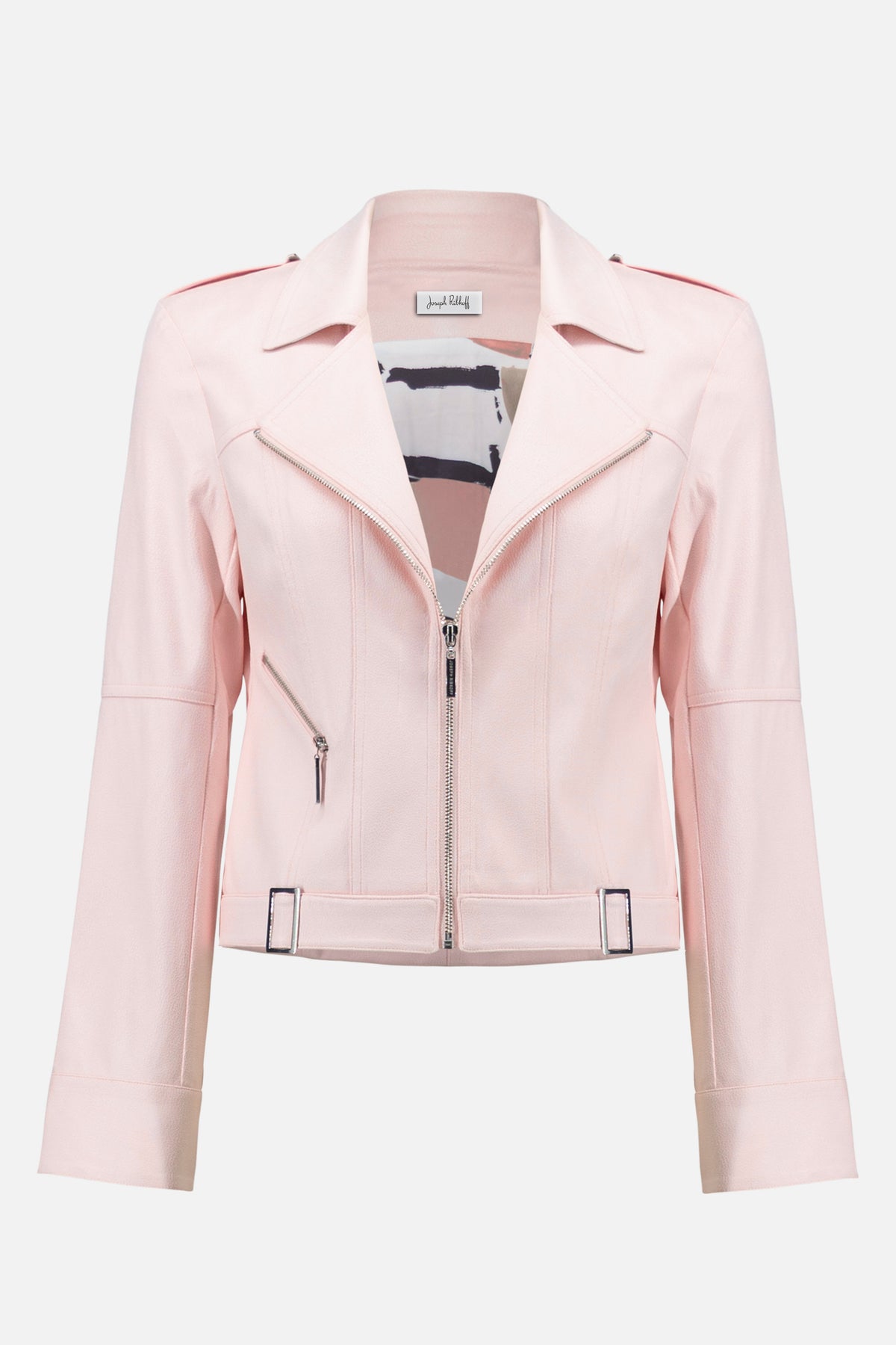 Elevate your wardrobe with this striking foiled faux suede jacket that combines contemporary edge with refined sophistication. The tailored fit flatters your silhouette while the zip-front closure ensures effortless styling. Decorative buckles at the hem create an eye-catching focal point, while snap cuffs and faux pocket zippers deliver authentic detail. Lined in luxurious printed satin, this jacket transitions seamlessly from day to night, making it an essential investment piece for any fashion-forward closet.