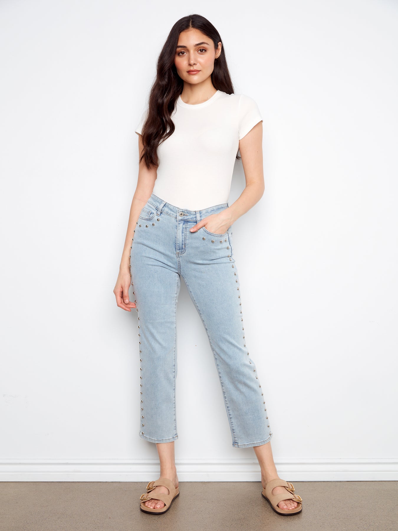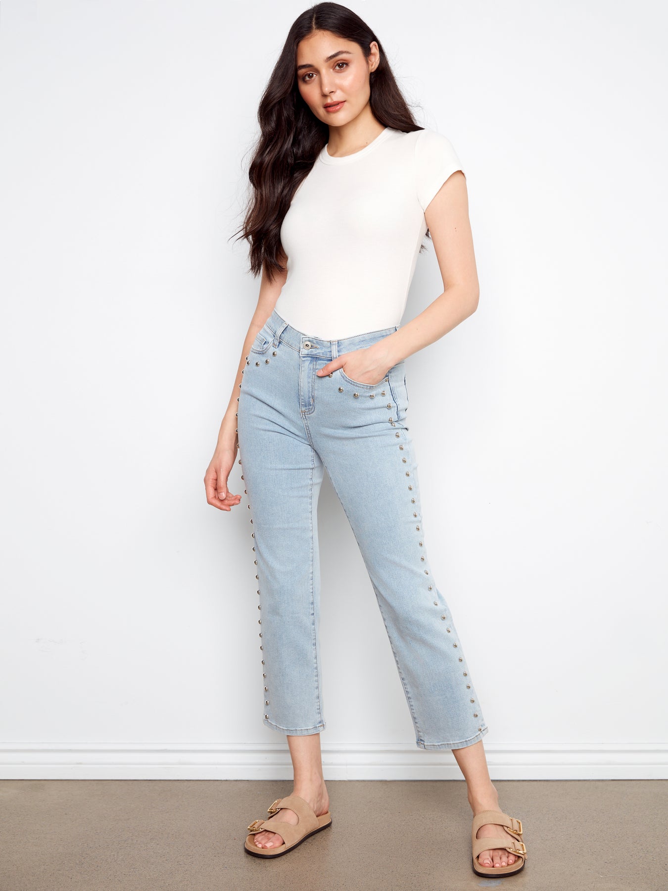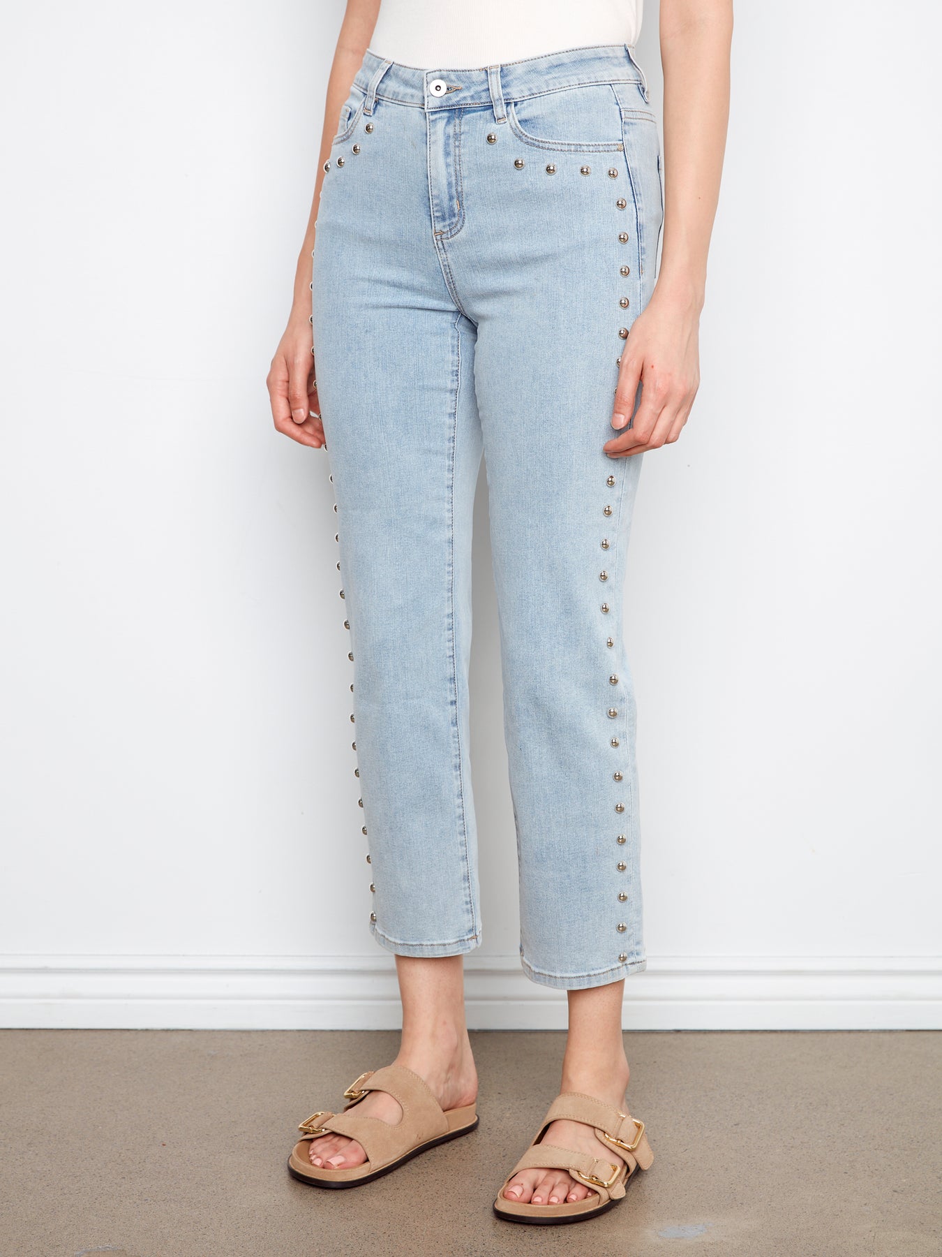 Rock these light-wash straight-leg jeans with studded details that command attention. The mid-rise fit sits smooth at the waist while the ankle-length cut showcases your footwear game. Crafted from structured yet comfortable denim, they're built to move with you all day while keeping that bold, modern edge.