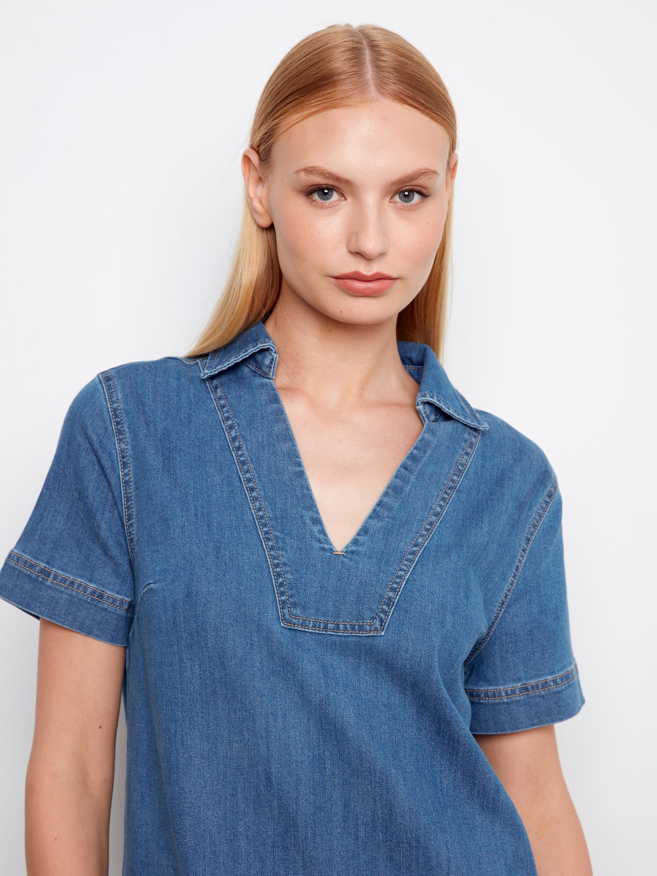 Denim dress that dares to be different. This collared V-neck mini features a relaxed shift cut with above-the-knee length, perfect for showing off your style. Contrast stitching and front pockets deliver classic denim edge with modern flair. Wear it solo or layer it bold—versatile enough to take risks with.