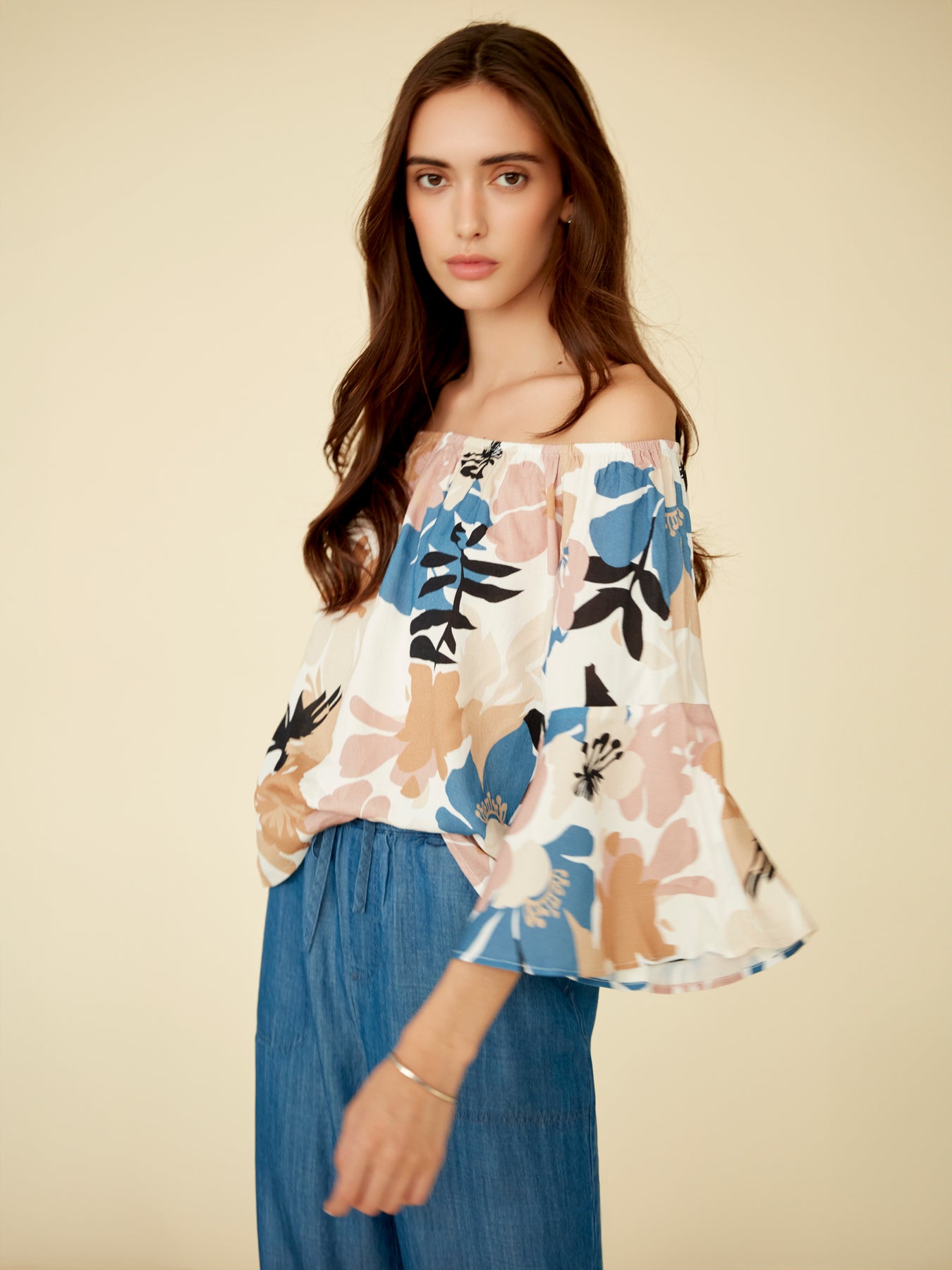 This breezy off-shoulder blouse brings effortless drama to warm-weather styling. The wide neckline sits beautifully across the shoulders, highlighting the collarbone while creating a soft, feminine silhouette. An allover floral-inspired print adds a bold yet airy feel, blending color and movement for standout appeal.