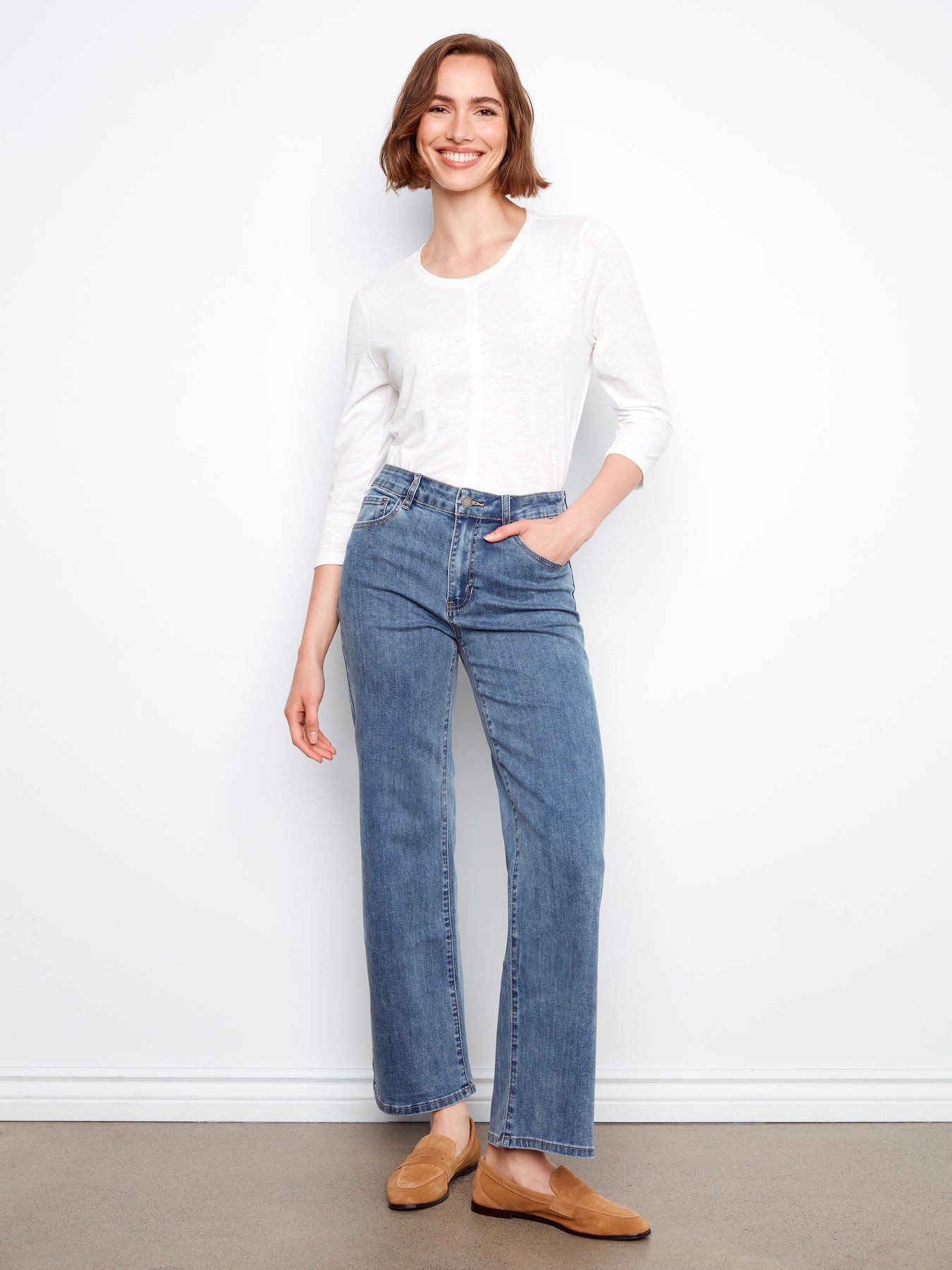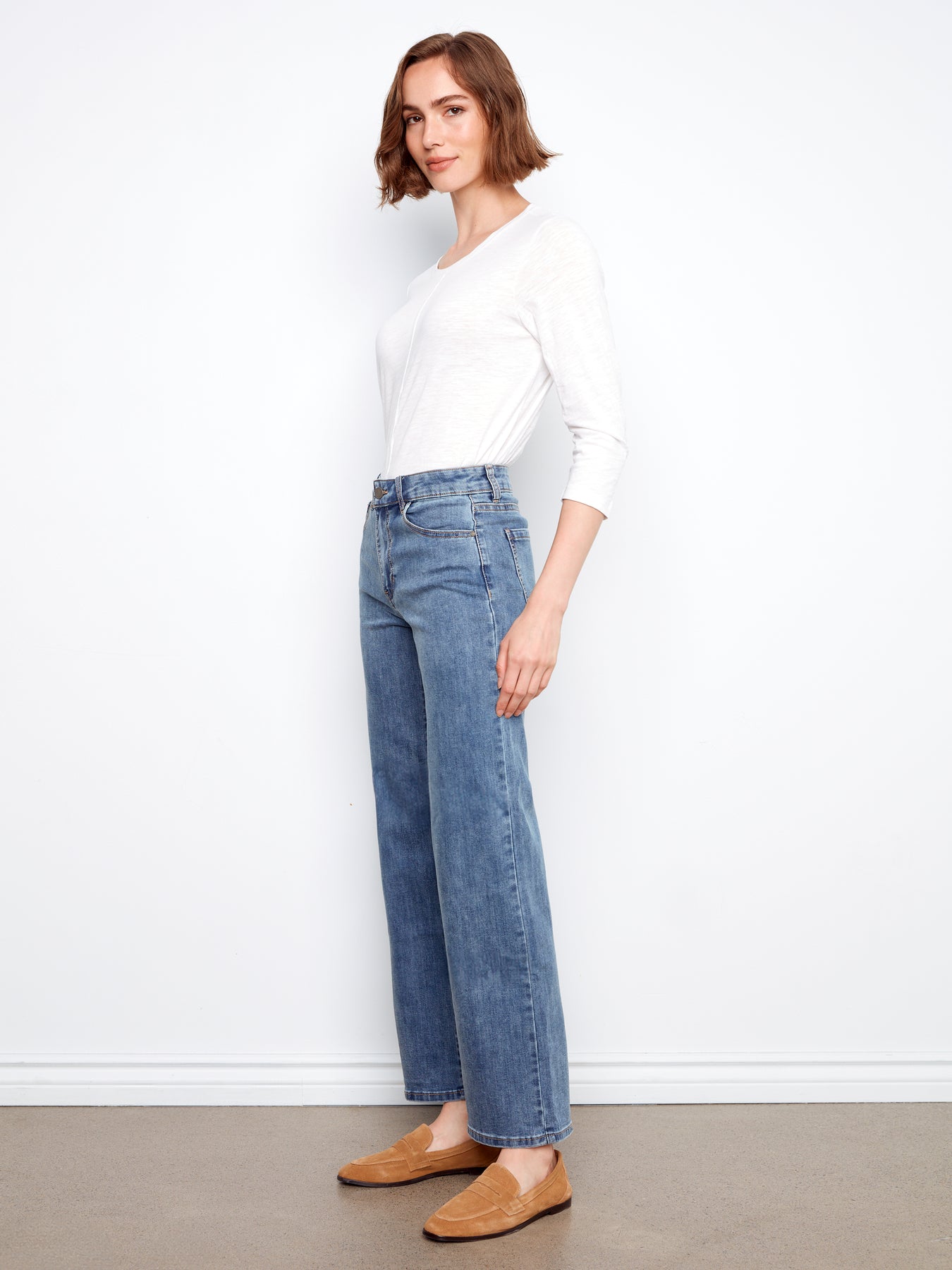 The Chloe Wide Leg Jeans bring effortless style to everyday dressing with their clean, flattering silhouette. Designed to sit smoothly through the waist and hips, they flow into a relaxed wide leg for a modern, elongated look. Crafted in soft stretch denim with classic five-pocket styling, they offer the perfect balance of comfort, versatility, and polished appeal.