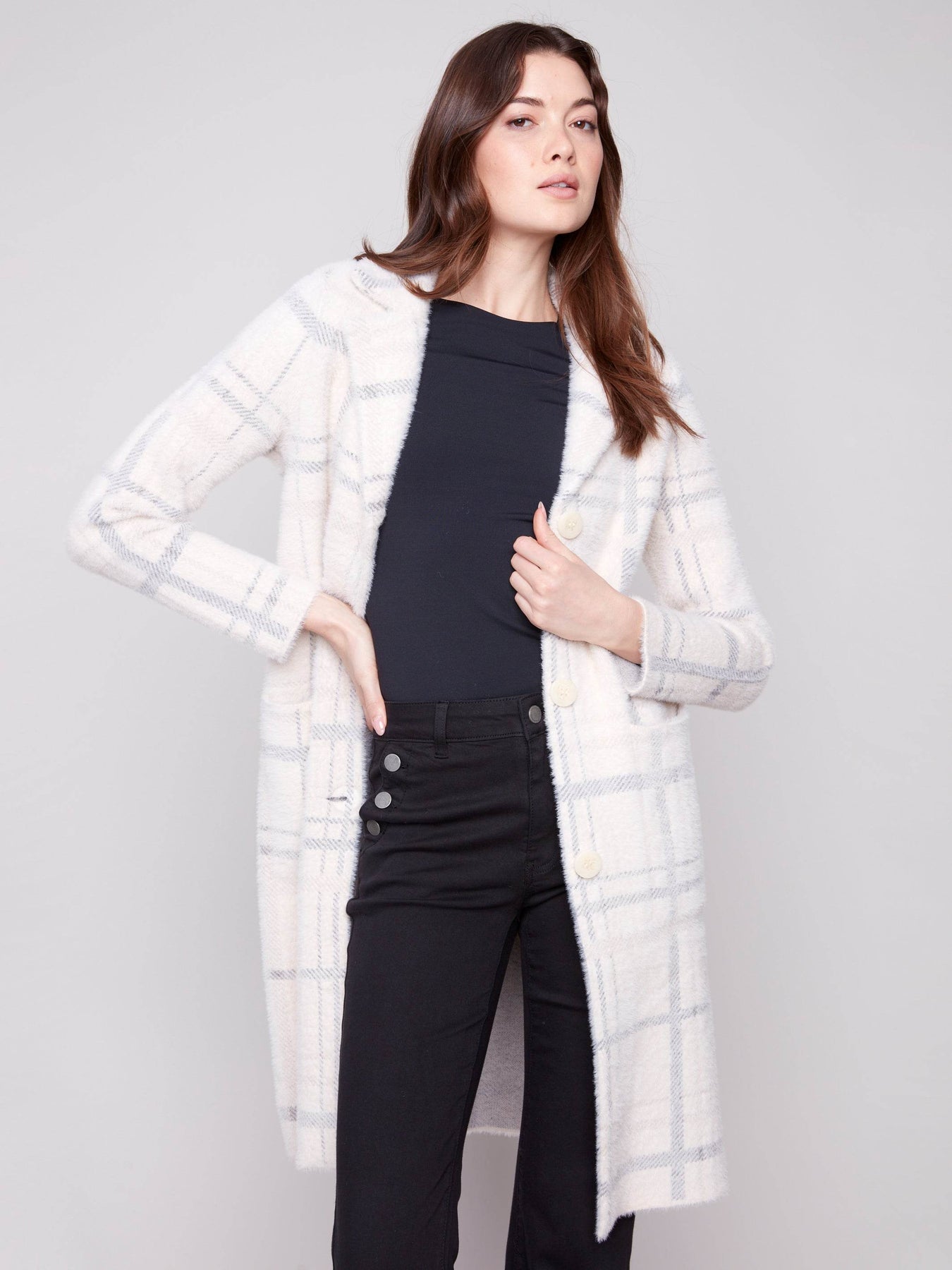 Elevate your wardrobe with the Long Plaid Knit Coatigan, a perfect blend of cozy knitwear and classic plaid style. Featuring a button-front design, this coatigan offers versatile layering for cooler days, combining the warmth of a sweater with the structure of a coat. Its long silhouette provides extra coverage and a flattering fit, making it ideal for both casual outings and more polished looks. Embrace comfort without sacrificing style with this timeless piece that effortlessly enhances any outfit.