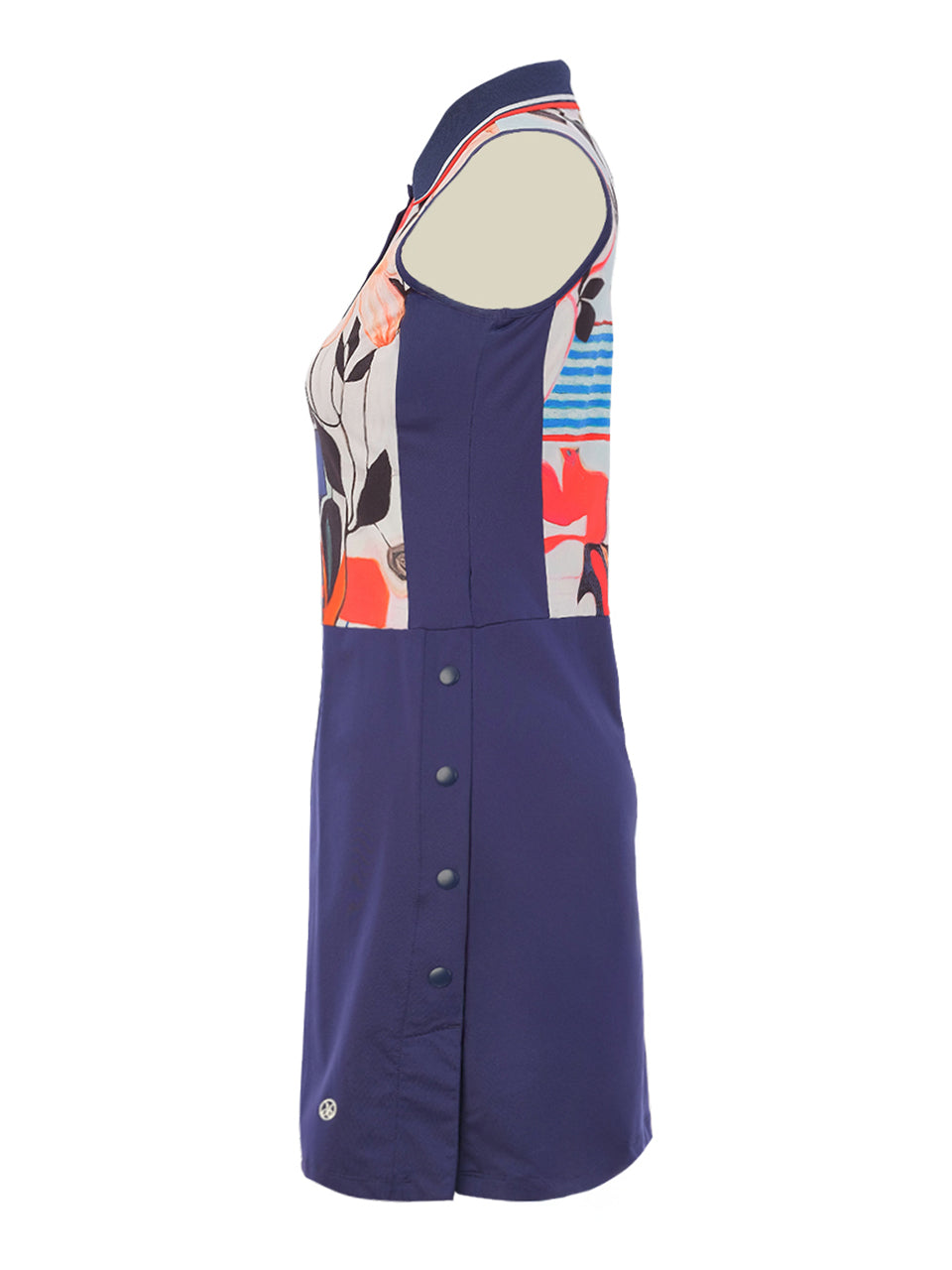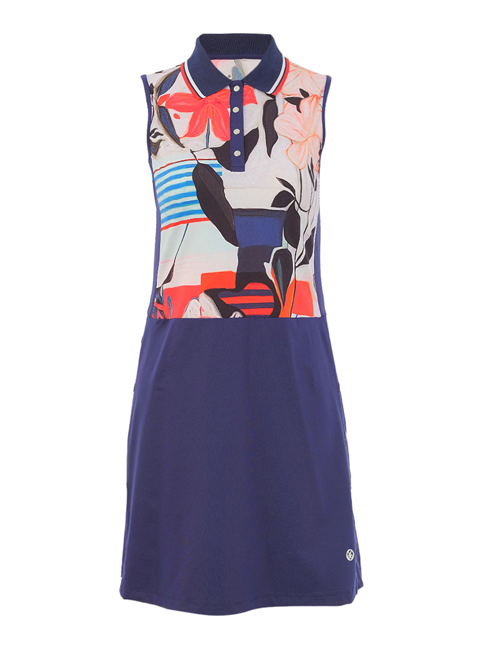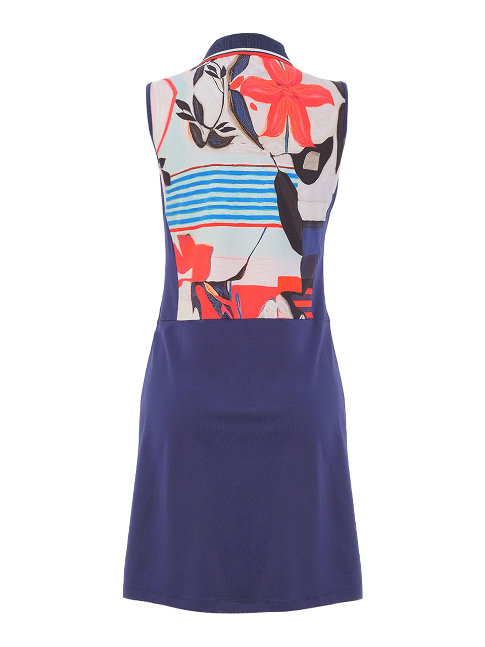 A sporty yet elegant golf dress designed for effortless movement on and off the course. The sleeveless silhouette features a striking artistic print panel across the bodice, paired with a sleek skort-style bottom that offers both style and functionality. Crafted for comfort and flexibility, it allows full range of motion while maintaining a polished, athletic look. Perfect for sunny days on the fairway, this piece blends modern sport performance with bold artistic flair.