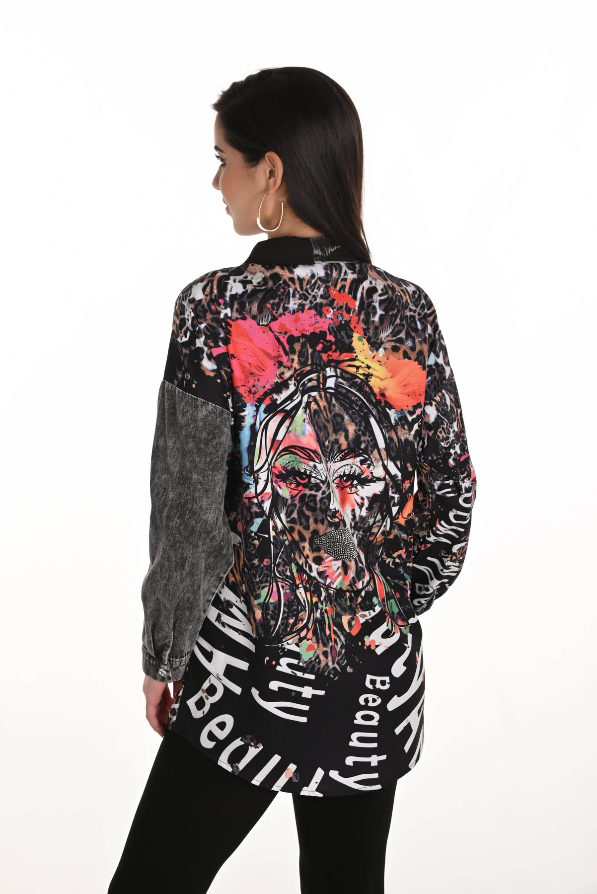Turn heads with this striking button-up shirt that’s anything but ordinary. Featuring a mix of denim, leopard print, graffiti-style text, and a vibrant abstract portrait on the back, this statement piece blends streetwear edge with artistic flair. Designed with a relaxed silhouette and roll-tab sleeves for an effortless fit, it’s perfect for days when you want your outfit to speak for itself.