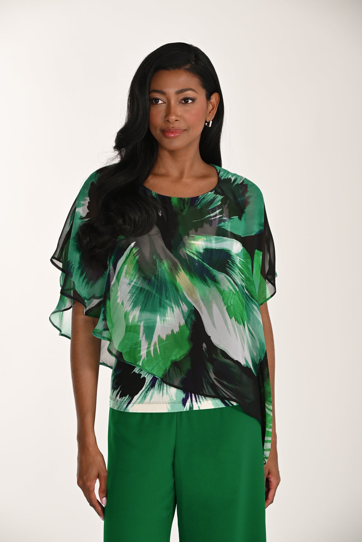 Elevate your wardrobe with this stunning floral chiffon overlay top. The sheer chiffon layer creates a graceful, floaty silhouette that drapes beautifully, while the bold abstract print in green, black, and ivory adds sophisticated visual impact. Perfect for those who want effortless elegance with modern flair.