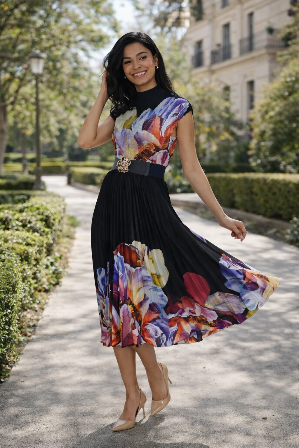 Black midi skirt with a stunning floral print hem that transitions from deep jewel tones to warm hues. Soft pleats create graceful movement while the pull-on waistband ensures all-day comfort. Perfect for creating an effortlessly polished look that stands out.