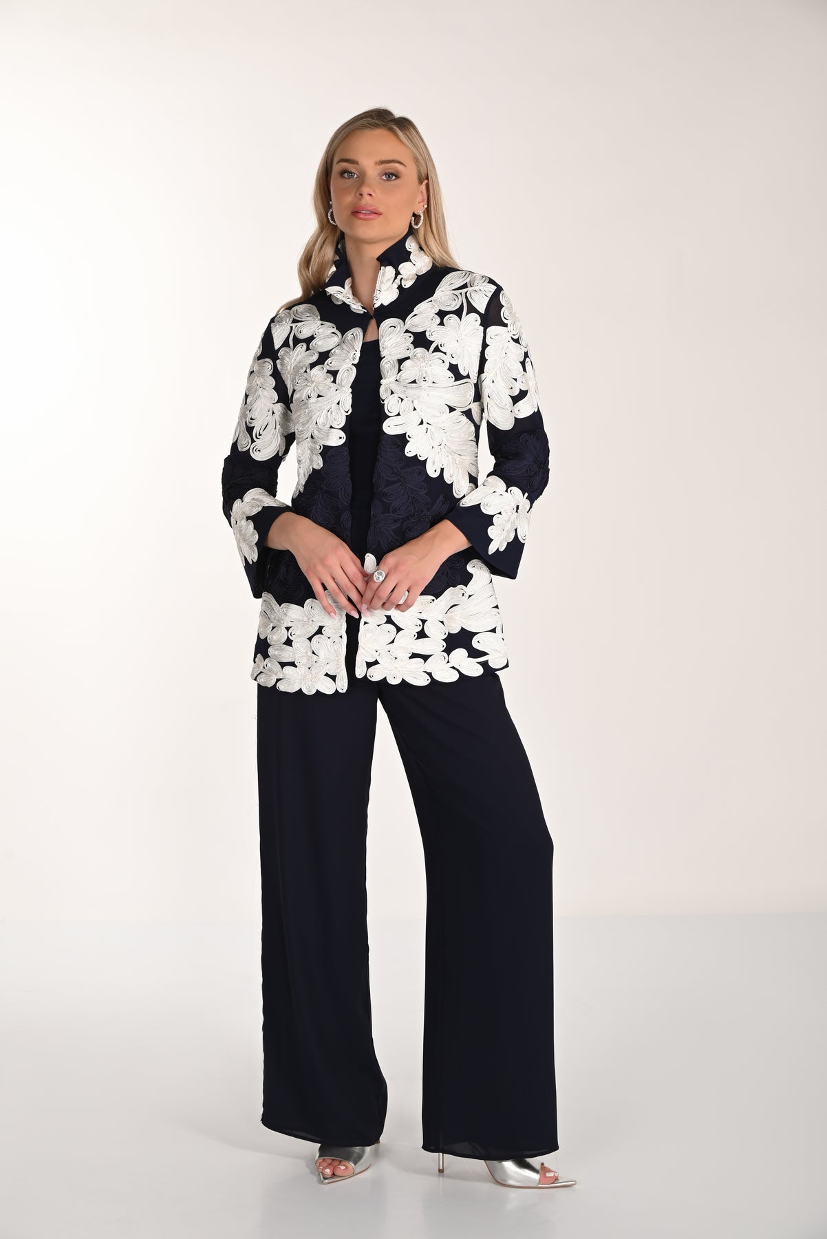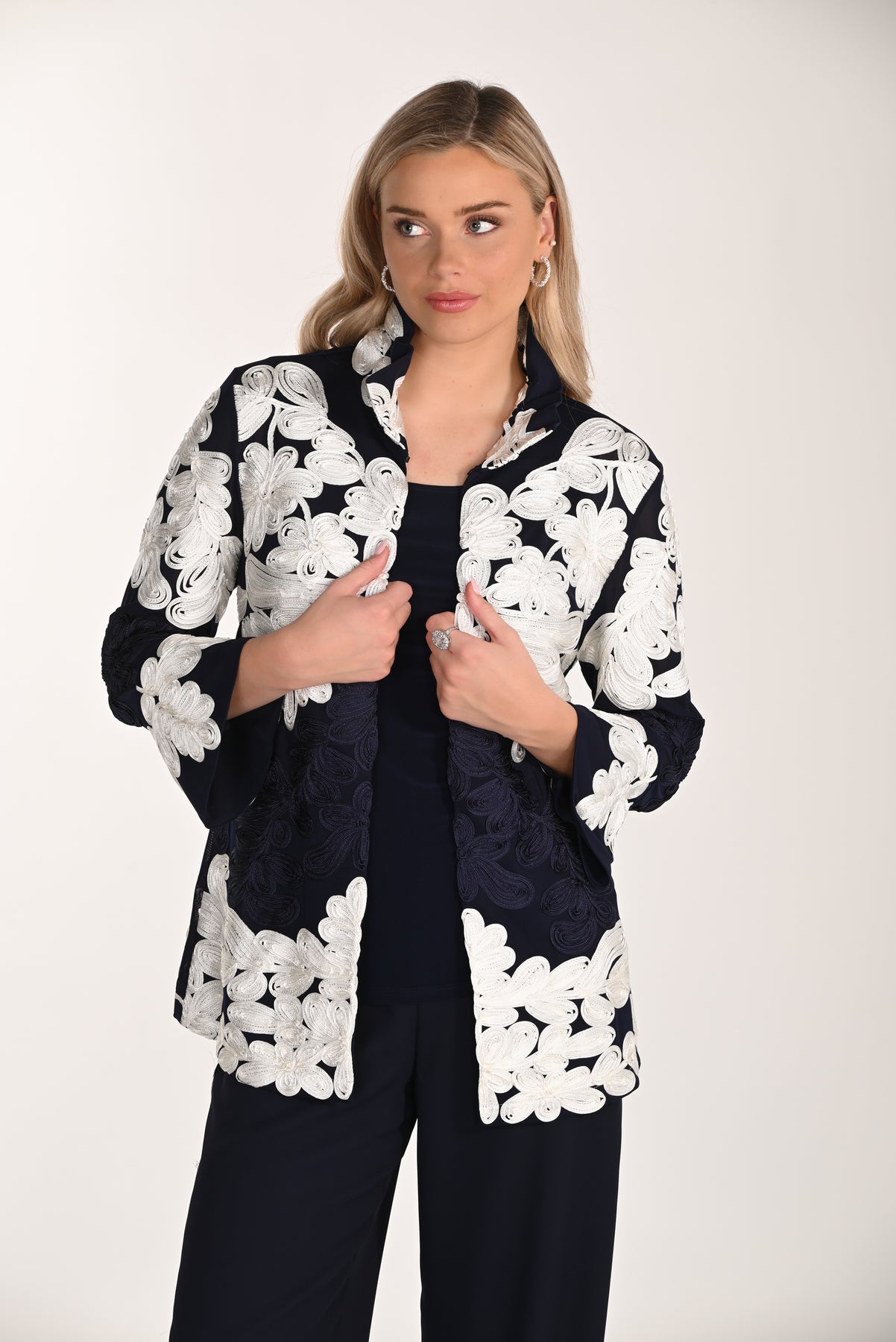 Make a lasting impression with this artfully crafted navy jacket, where intricate ivory floral embroidery adds depth and visual interest to every wear. The tailored construction and refined collar create an undeniably polished aesthetic, while contemporary three-quarter sleeves prevent the look from feeling dated. Whether you're dressing for an important event or an upscale evening out, this captivating piece elevates your wardrobe—style it with matching navy trousers or modern separates for an effortlessly sophisticated finish.