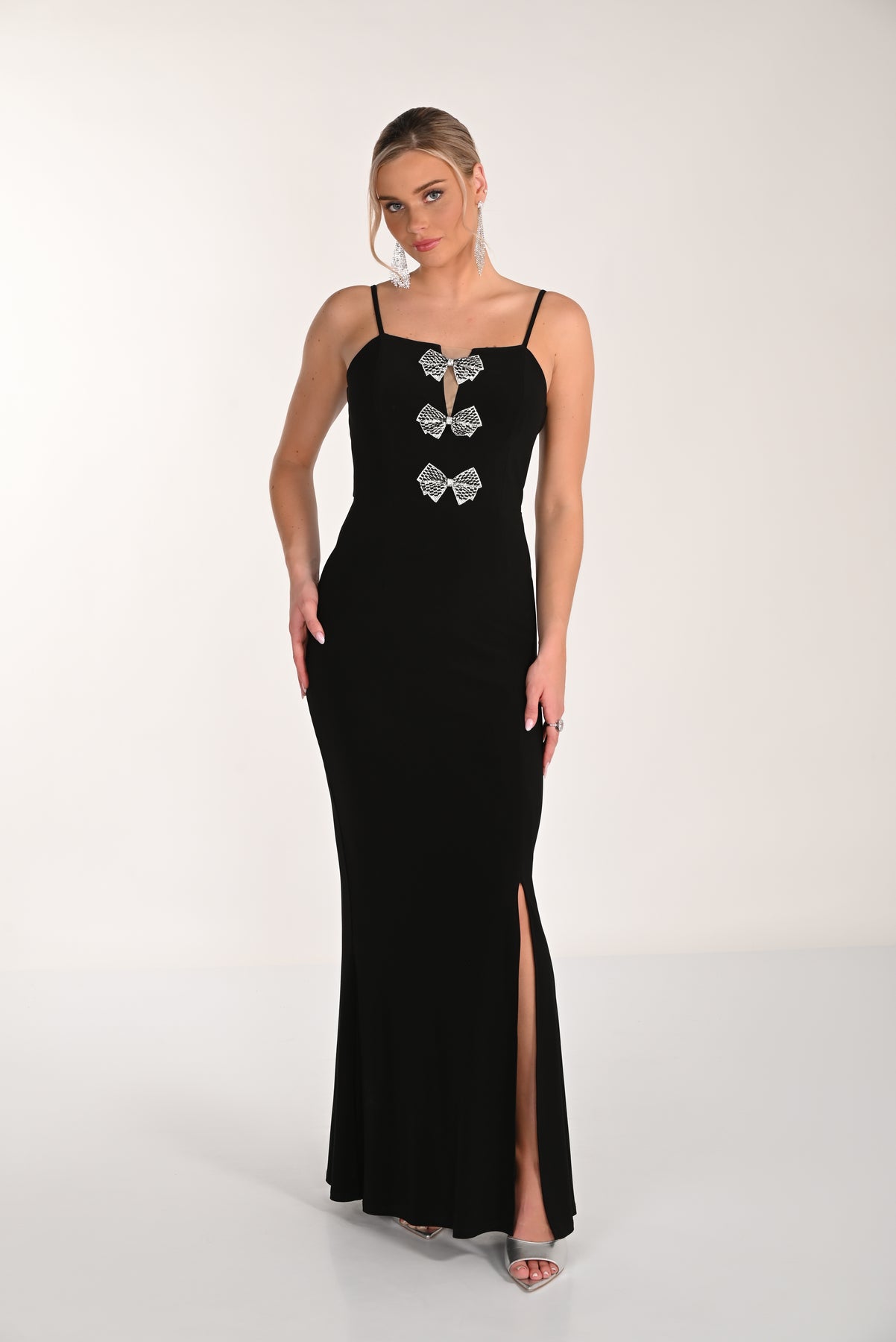 Elegant midnight gown with a sleek, floor-length cut and flattering silhouette. Features delicate spaghetti straps, a front slit, and three stunning crystal bows on the bodice for added glamour. Ideal for galas and formal events where you want to turn heads.