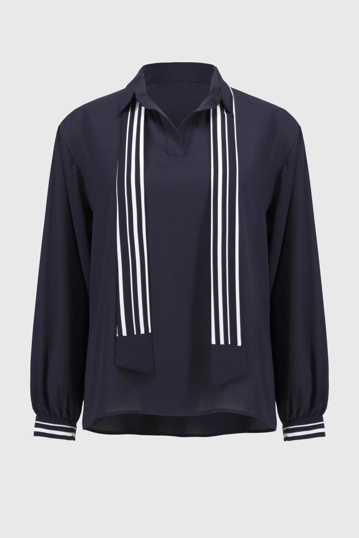 This elegant georgette blouse features a light, flowing shape paired with a stylish woven stripe scarf. It includes an open shirt collar, long puffed sleeves finished with matching striped cuffs, and a back pleat, making it a chic and adaptable addition to your wardrobe.