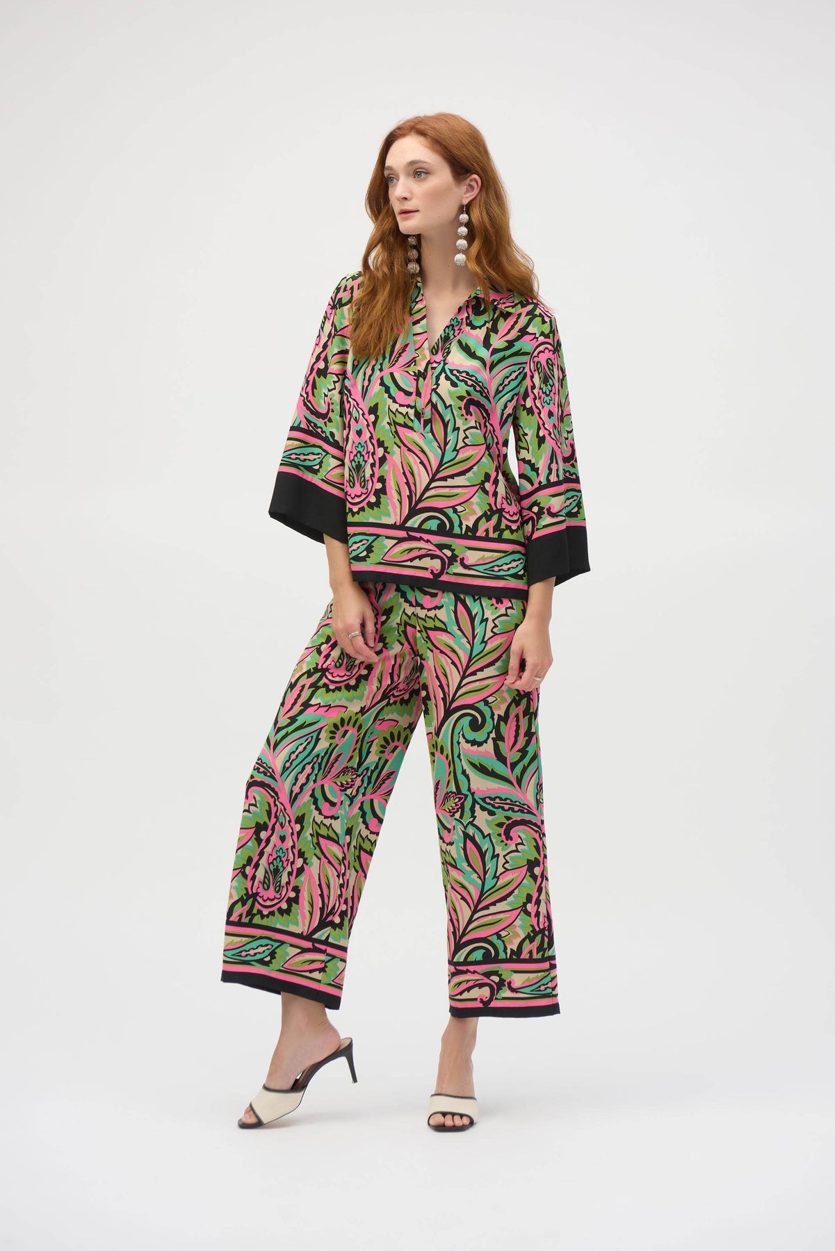 Step out boldly in these woven wide-leg pants adorned with a striking paisley pattern that elevates their chic look. Designed with practical side pockets, they blend fashion with convenience effortlessly. The back shirred elastic waistband adds a stylish twist, making this modern piece both comfortable and eye-catching.