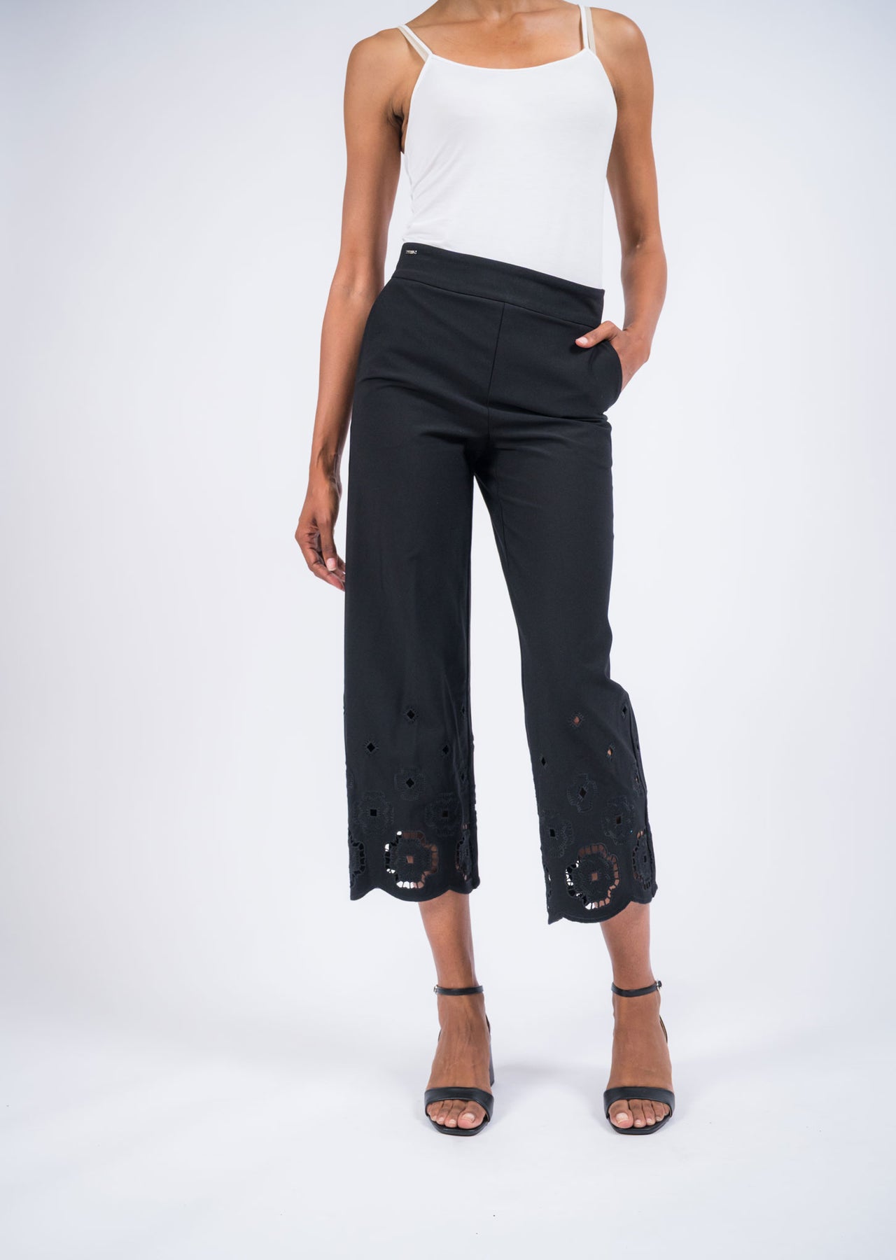 Elevate your everyday style with these chic wide-leg cropped pants, designed with a clean pull-on waistband for a smooth and flattering fit. The relaxed silhouette offers effortless comfort, while the cropped length creates a modern, airy look. Delicate cut-out embroidery along the hem adds an elegant touch of detail, making these pants perfect for both casual days and polished outings. Pair them with a simple top and sandals or heels for a refined yet relaxed ensemble.