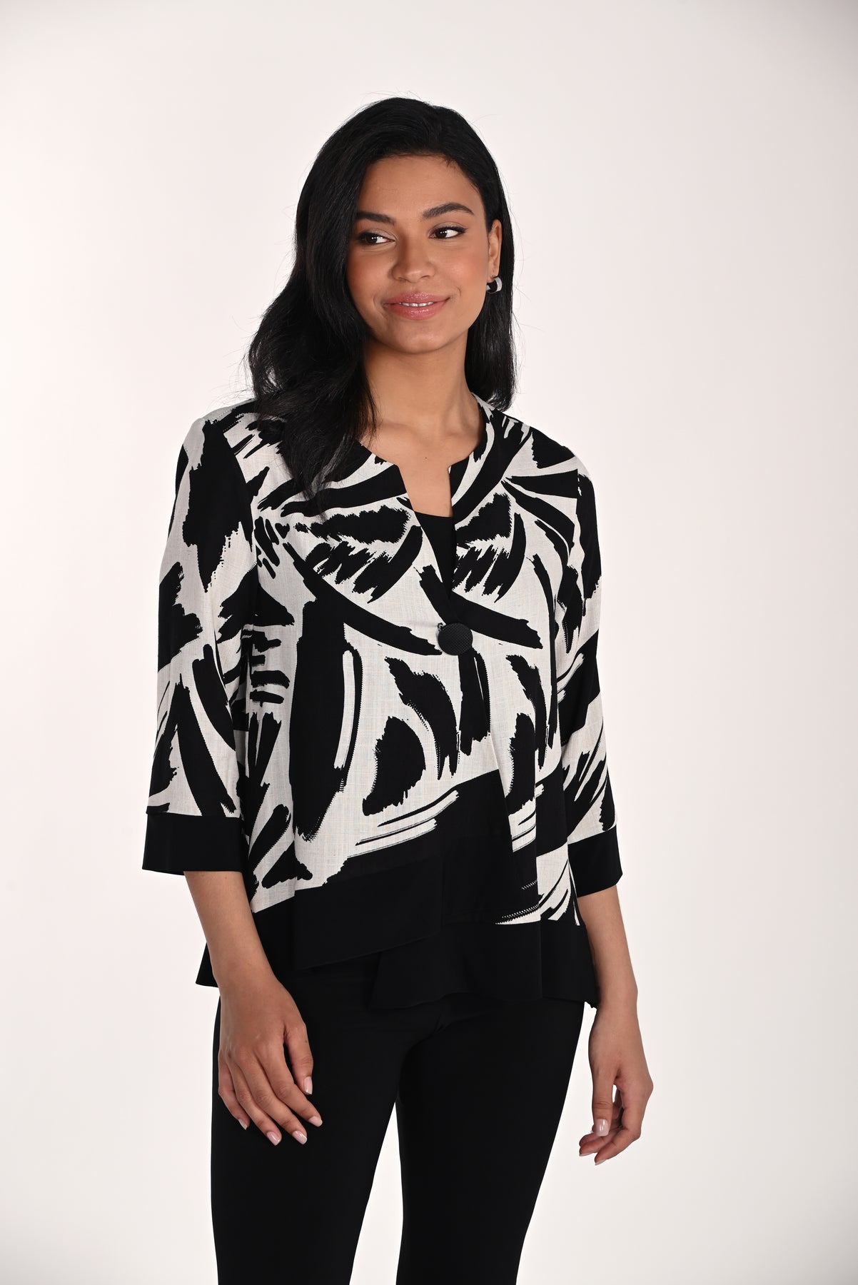 This cropped jacket combines artistic flair with polished tailoring. The dramatic black and ivory brushstroke print makes a statement, while the structured yet softly draped silhouette flatters your figure. Layer it over dresses or separates for instant style elevation.
