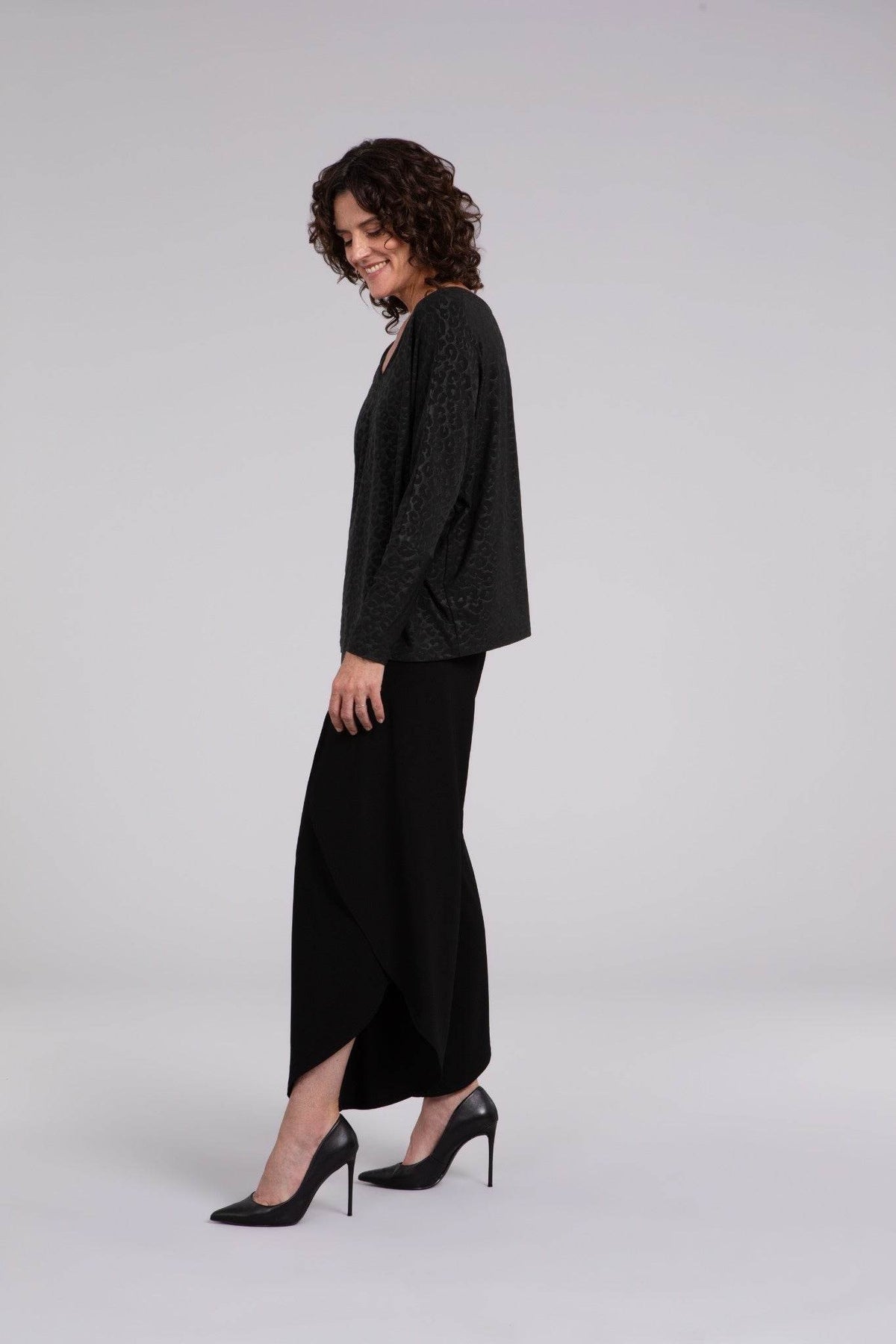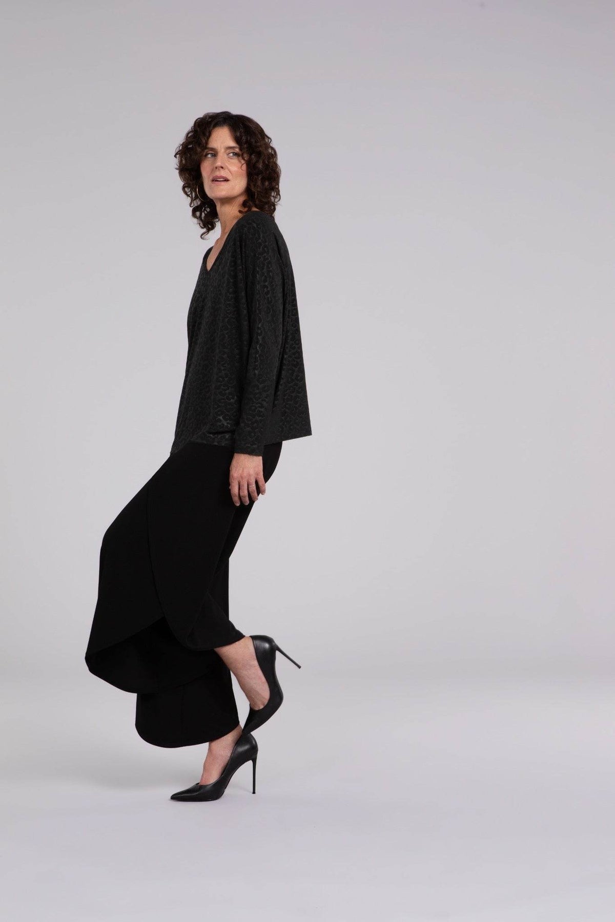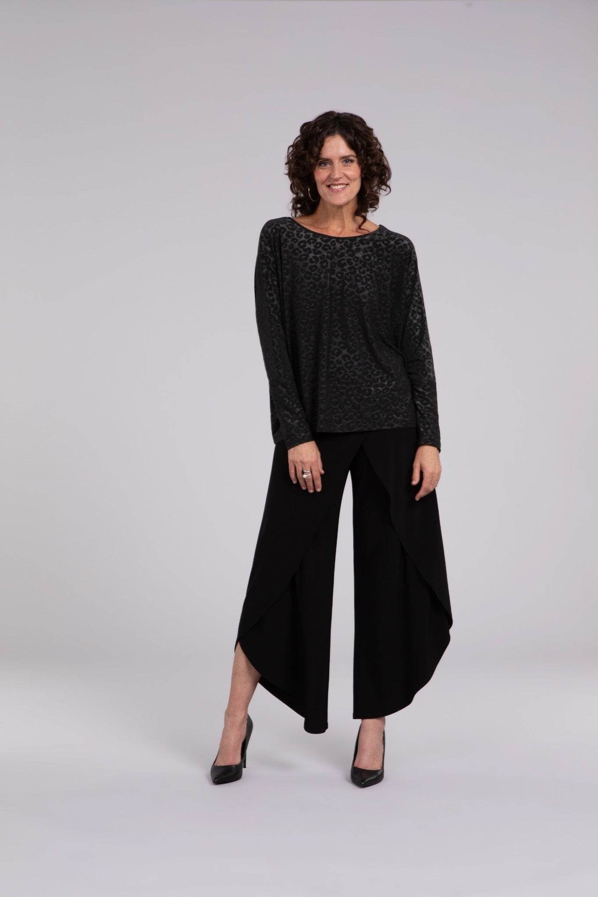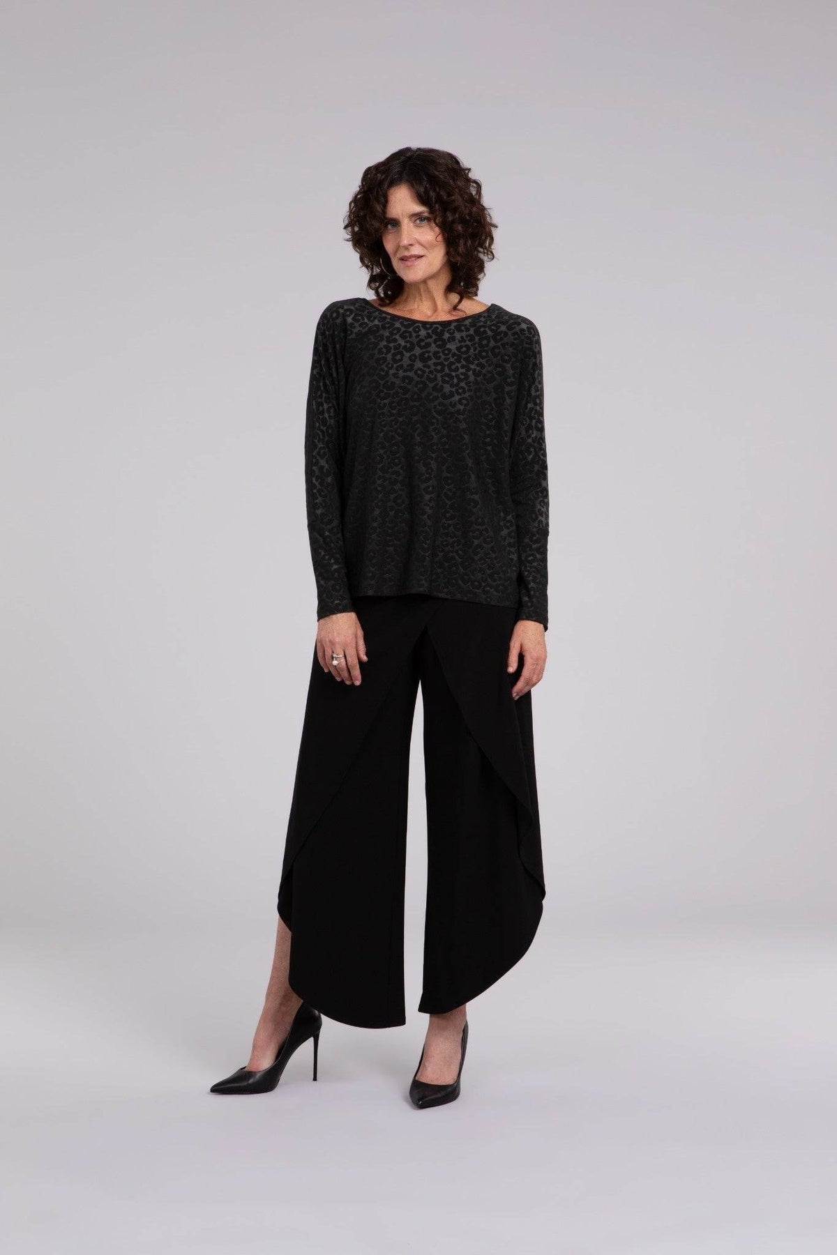 This slightly boxy top combines comfort with chic style, perfect for day-to-night wear. It features a reversible neckline that shifts from a U to a V and elbow-length sleeves, enhanced by a subtle and stylish animal print. Effortlessly elegant, this top is sure to become a wardrobe favorite!