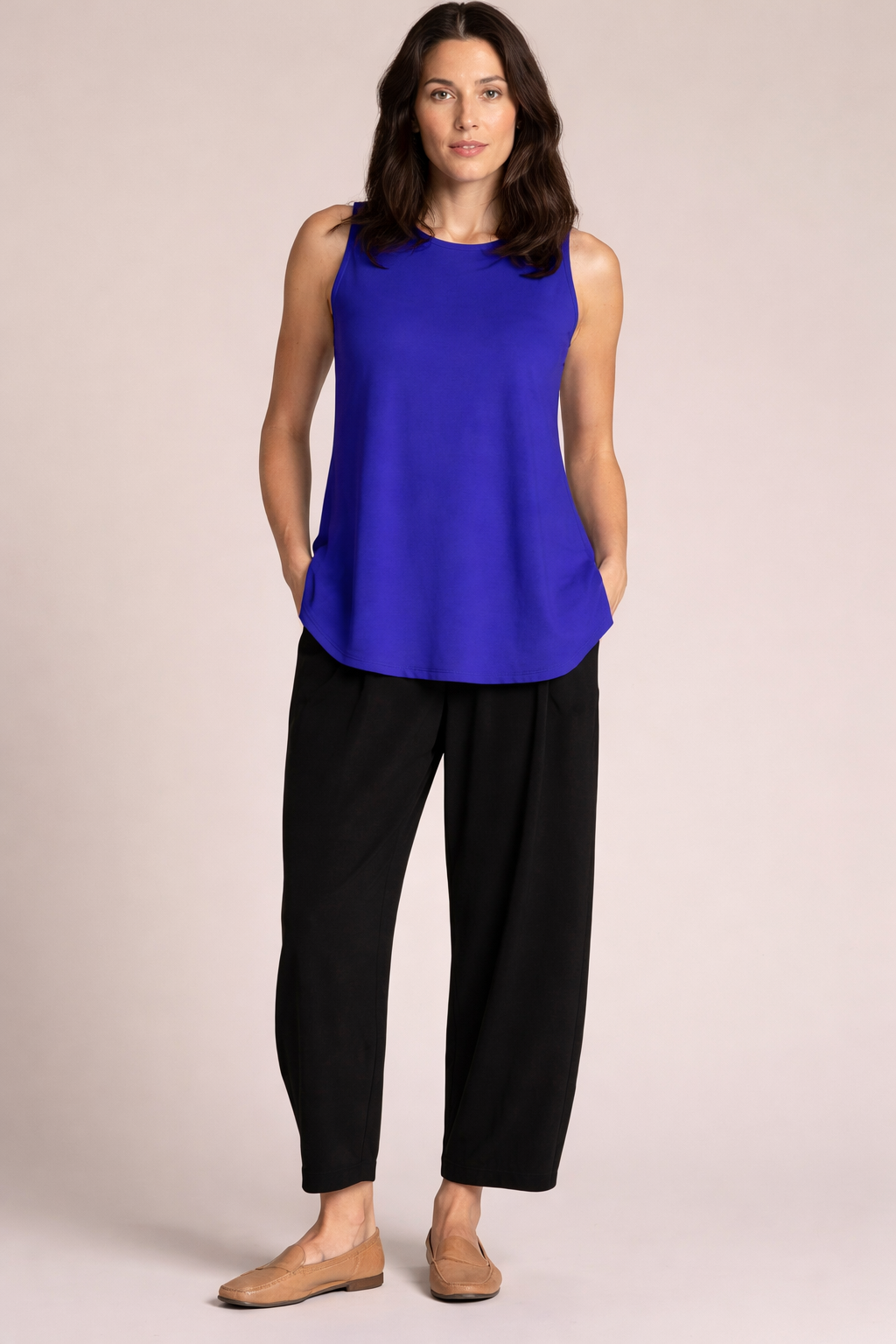 Embrace total confidence in this timeless tank, perfect for any occasion. The Sleeveless Go To Classic T Relax is a wardrobe essential for all seasons, crafted from our versatile and luxurious washable fabric. It offers a relaxed fit and optimal stretch, with a scoop neckline and flattering side slits for effortless draping.
