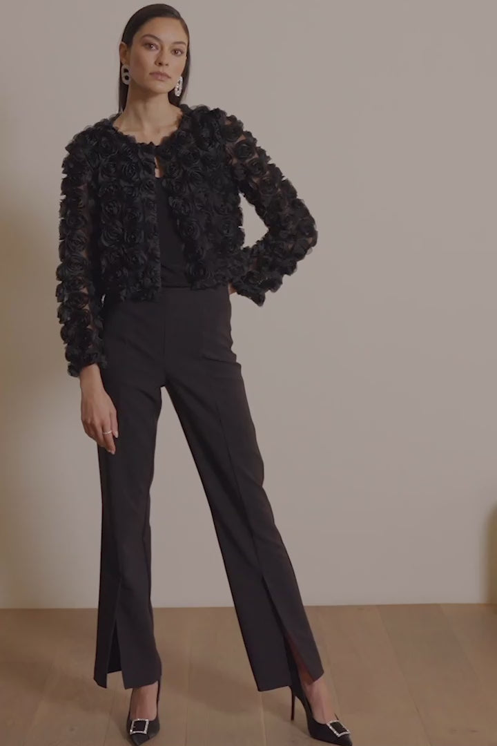Sublimez votre garde-robe avec ce boléro sophistiqué, orné de délicates rosettes tissées en 3D qui apportent une touche d'élégance instantanée à toutes vos tenues. Sa coupe courte et ajustée et ses manches longues sculptent une silhouette raffinée et flatteuse, idéale à porter sur une robe ou avec un pantalon taille haute. Parfait pour transformer un moment décontracté en une occasion mémorable, ce boléro insuffle à votre garde-robe une féminité intemporelle et un style polyvalent.