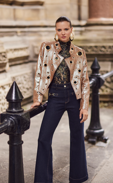 Audacieuse, moderne et conçue pour faire sensation. Cette veste de motard métallisée est ornée d'œillets dorés qui font écho aux détails métalliques emblématiques du jean large Icon Detail, créant ainsi un look tendance et parfaitement coordonné. Sa coupe courte souligne la taille et flatte la silhouette, tandis que sa finition luxueuse légèrement délavée apporte profondeur et relief.