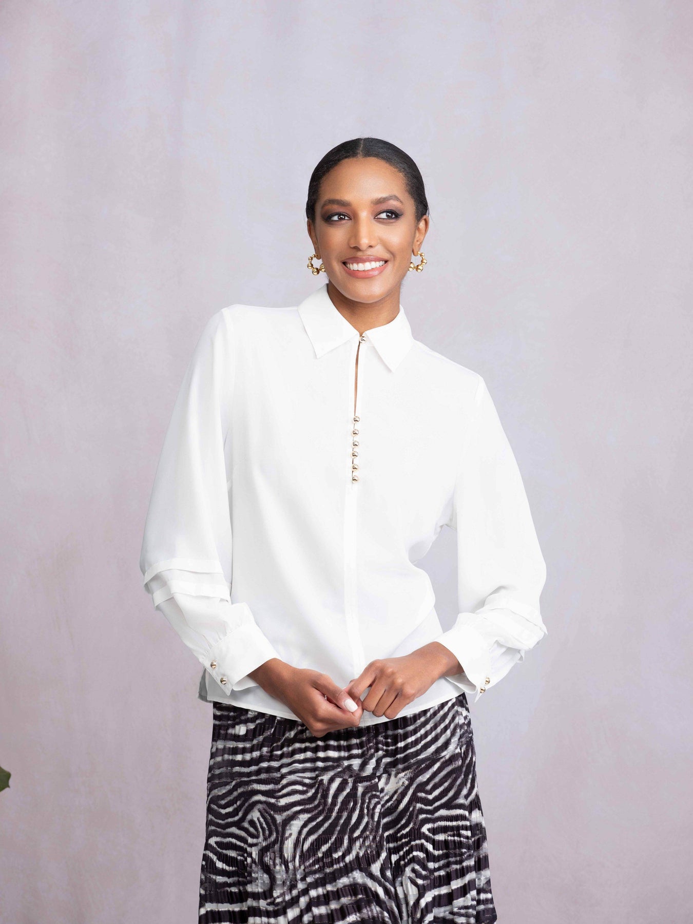 Sublimez votre garde-robe avec notre blouse à boutons, une pièce polyvalente idéale pour le travail comme pour les soirées. Dotée d'un col pointu élégant, de délicats boutons sur le devant et d'une patte de boutonnage invisible pour une finition impeccable, cette blouse est confectionnée dans un tissu fluide et léger au tombé sublime. Les manches longues à poignets froncés et les boutons dorés apportent une touche de sophistication, tandis que sa coupe décontractée garantit un confort optimal tout au long de la journée. Disponible en blanc éclatant et en violet vibrant, cette blouse s'accorde facilement avec un pantalon tailleur, une jupe ou votre jean préféré pour un look chic et raffiné.