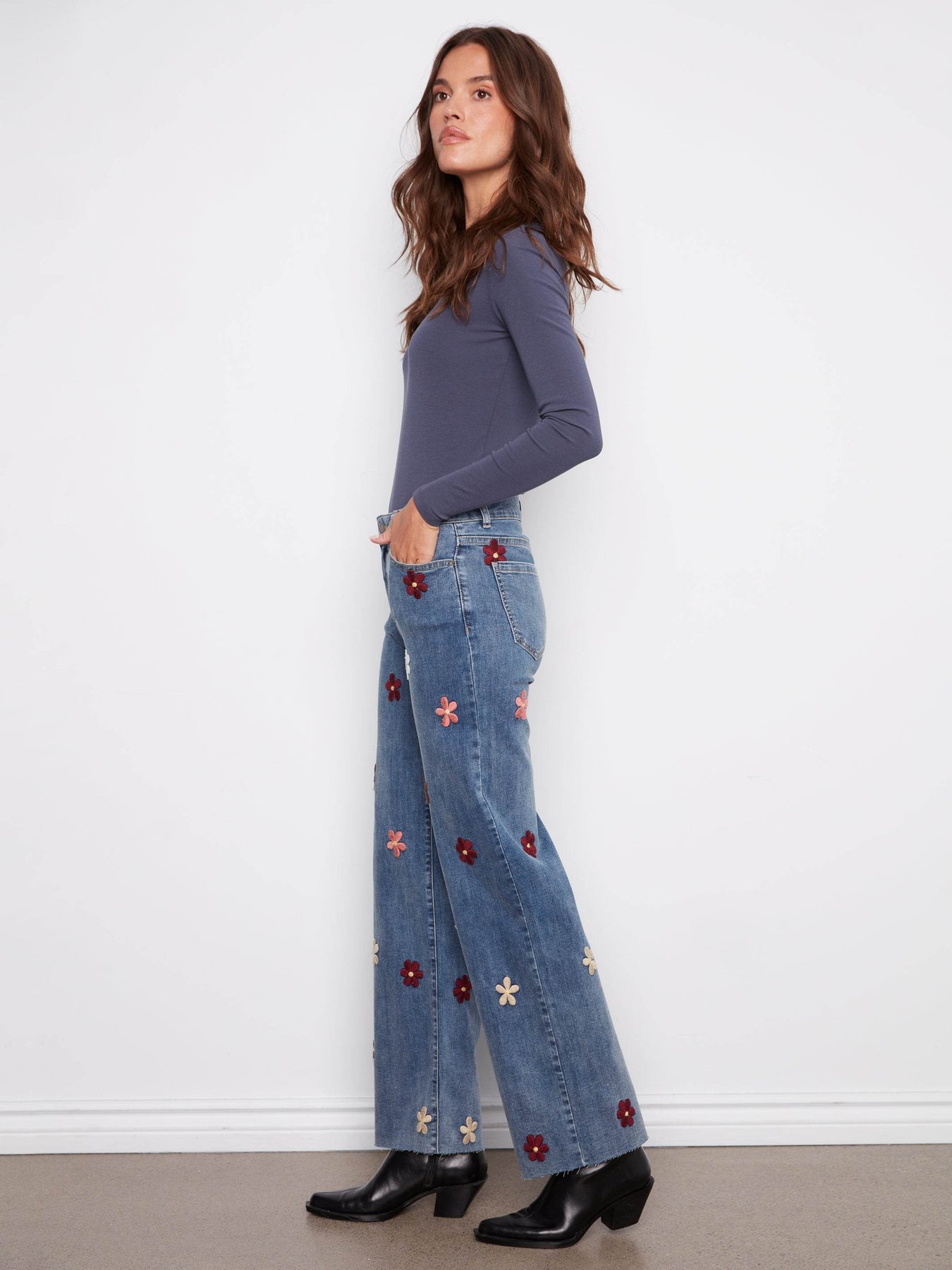 Jean à jambes larges avec écussons fleuris
