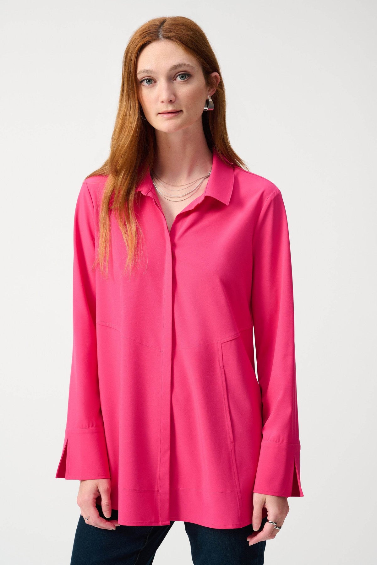 Adoptez un style décontracté avec cette blouse boutonnée en maille, à la coupe trapèze flatteuse. Sa patte de boutonnage cachée et ses fentes aux poignets apportent une touche raffinée à la chemise boyfriend classique. Conçue pour être portée hors du pantalon, elle s'accorde parfaitement avec un pantalon slim pour un look à la fois élégant et décontracté.