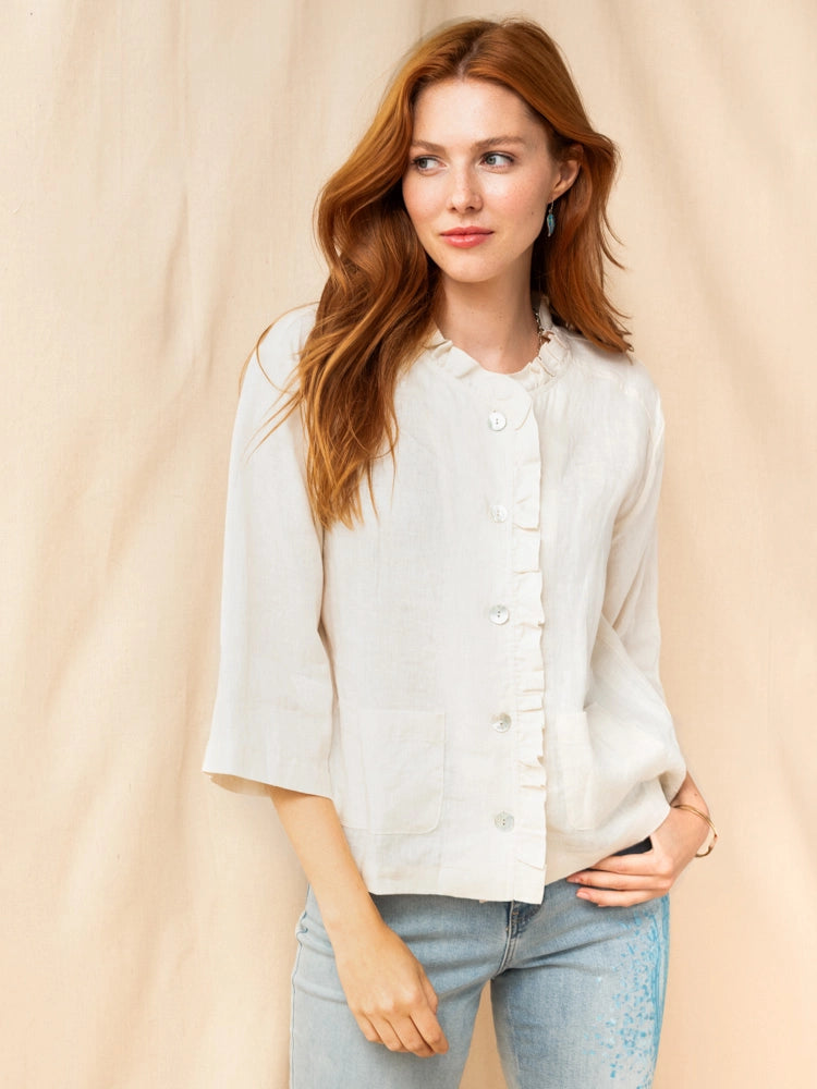 This lightweight cardigan features delicate ruffle trim along the button front for a soft, feminine touch. Designed with three-quarter sleeves and front pockets, it’s an easy layering piece that adds a fresh and polished feel to any outfit.