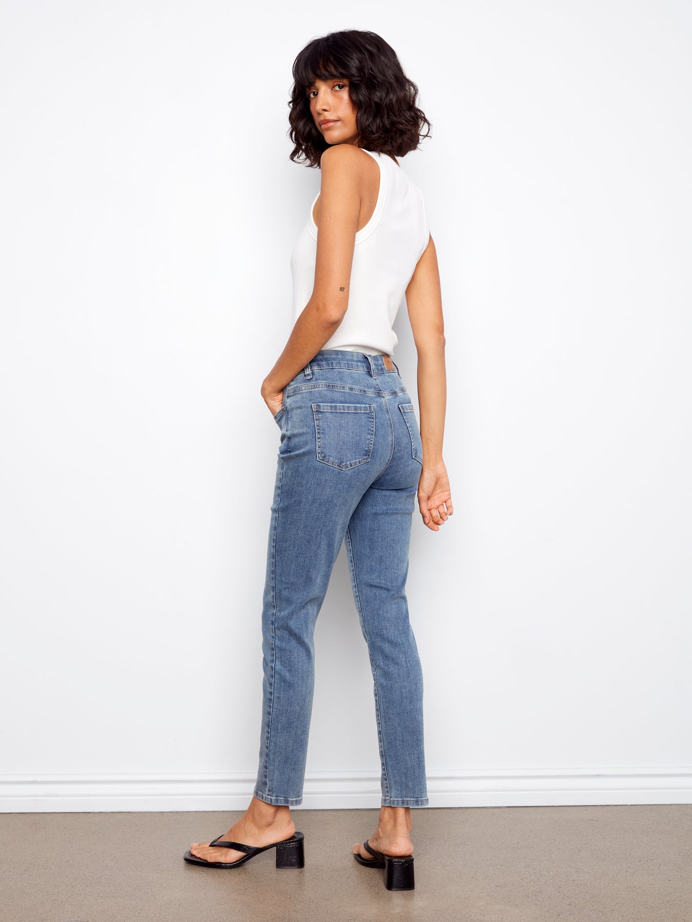 The Claudia Slim Leg Jeans combine timeless denim styling with a sleek, modern fit. Designed with a flattering slim leg silhouette, they feature a classic five-pocket construction, a comfortable mid-to-high rise, and soft stretch denim for easy movement throughout the day. The clean, versatile look makes them an effortless choice for dressing up with heels or keeping casual with everyday basics.