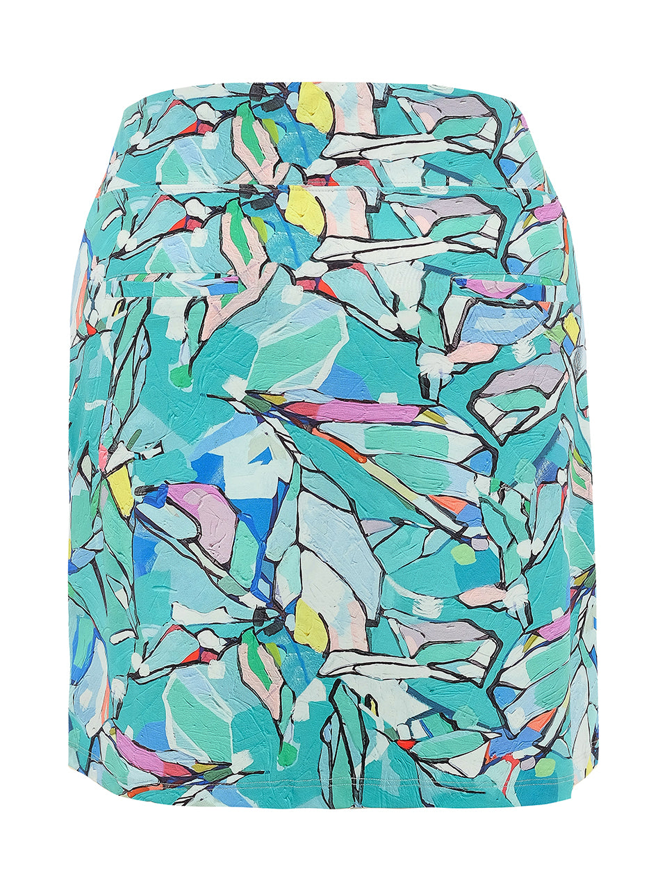 A vibrant golf skort featuring an artistic mosaic-inspired print in refreshing shades of turquoise, aqua, soft blue, and touches of coral. Designed with a sleek pull-on waistband and flattering straight silhouette, it offers comfort, stretch, and effortless movement on the course. Stylish and sporty, this skort brings a bold, painterly touch to your warm-weather golf wardrobe. ⛳️