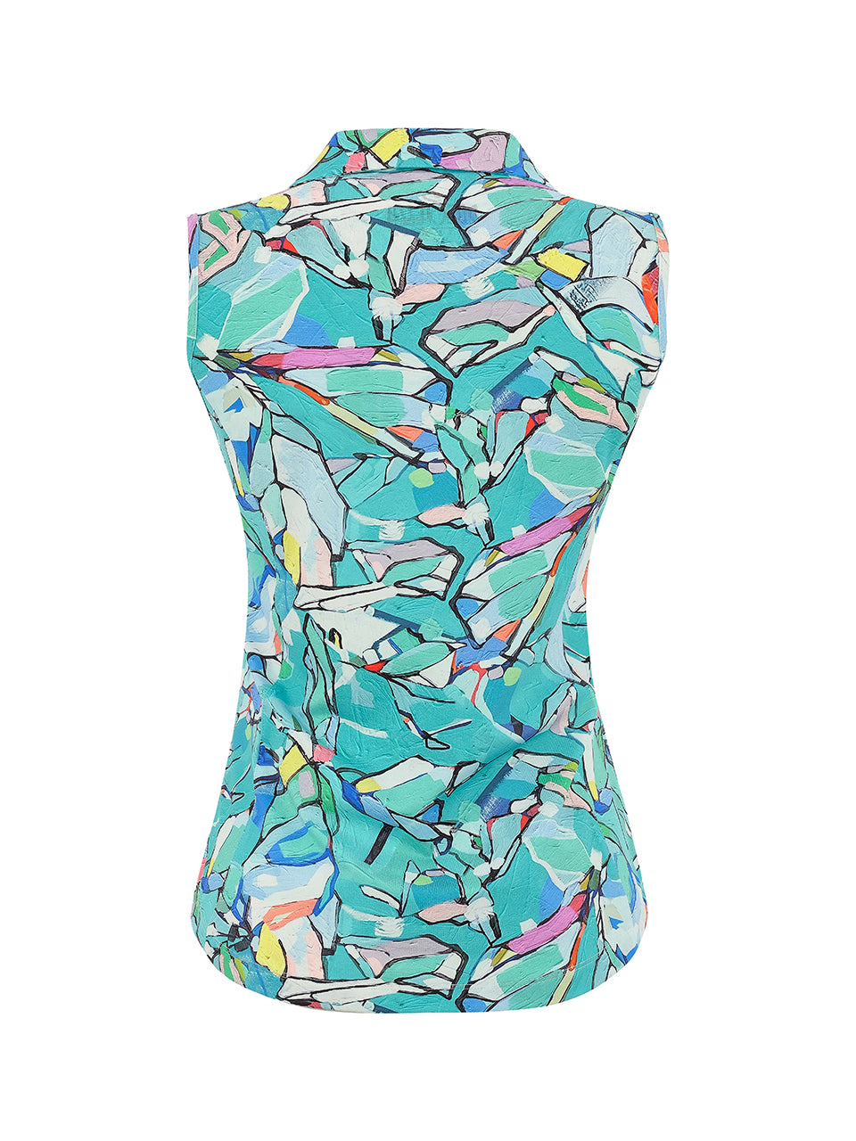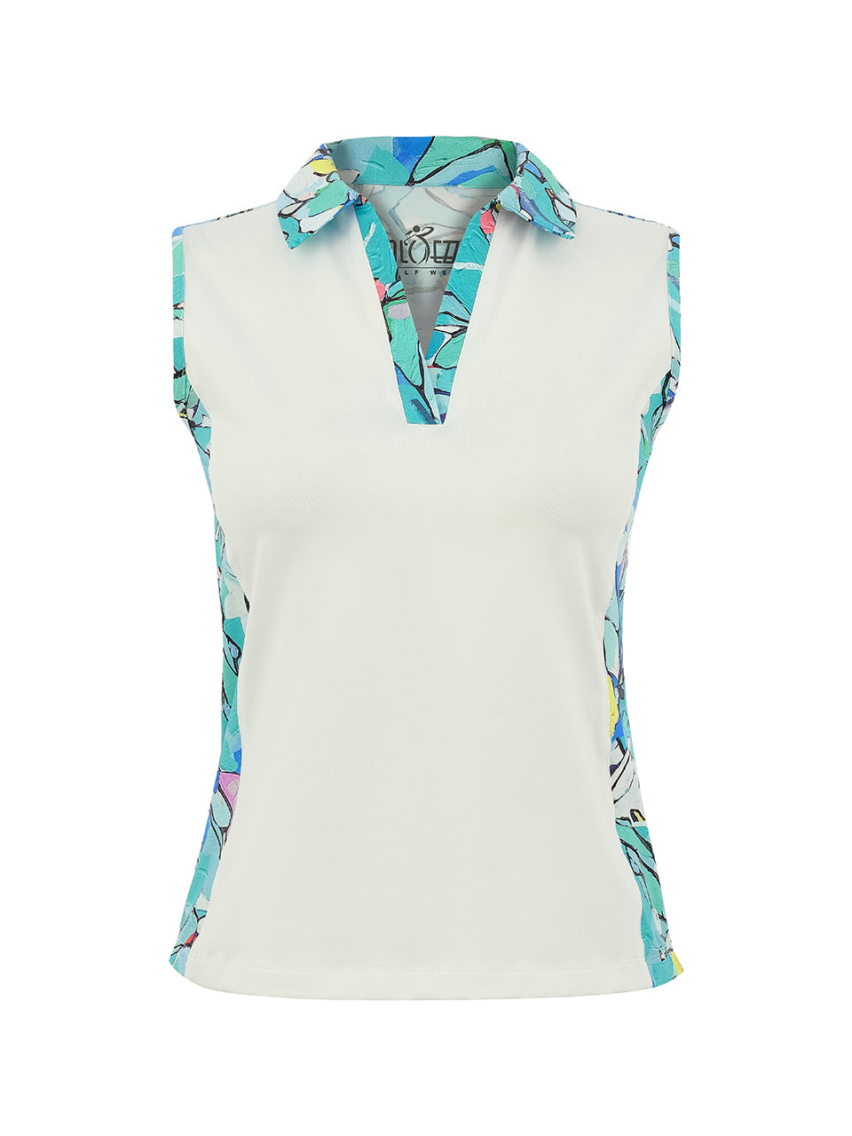 A polished sleeveless polo that blends sporty ease with artistic detail. The clean ivory body is accented by a vibrant mosaic-inspired print along the collar and sides, featuring fresh shades of turquoise, blue, and soft coral. Finished with a classic collar and flattering V-notch neckline, this lightweight top delivers comfort, movement, and modern elegance—perfect for the course or casual summer styling.