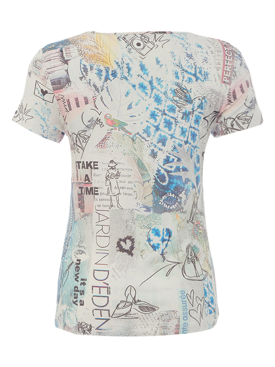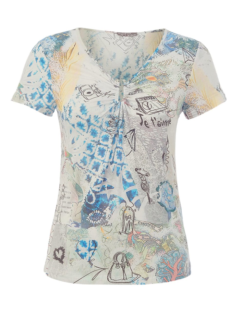 Effortlessly artistic and easy to wear, this short sleeve V-neck tee features a whimsical collage-inspired print in soft coastal blues and sandy neutrals. Delicate sketches, abstract motifs, and watercolor textures blend together to create a wearable canvas with a relaxed, creative spirit. Designed in a flattering, softly shaped silhouette, it pairs beautifully with white denim or light summer trousers. Casual yet expressive, this piece brings Dolcezza’s gallery-inspired artistry into everyday dressing.