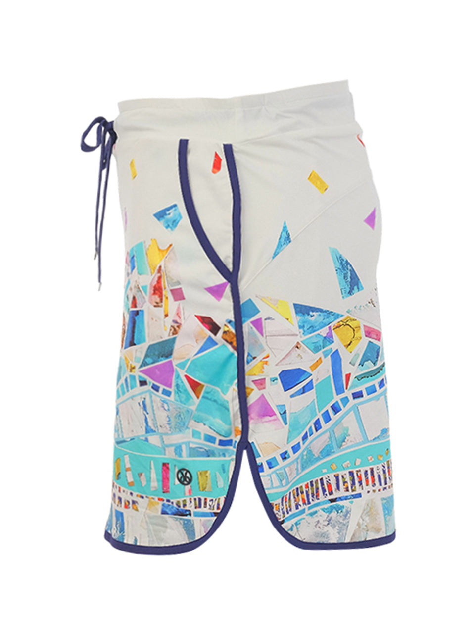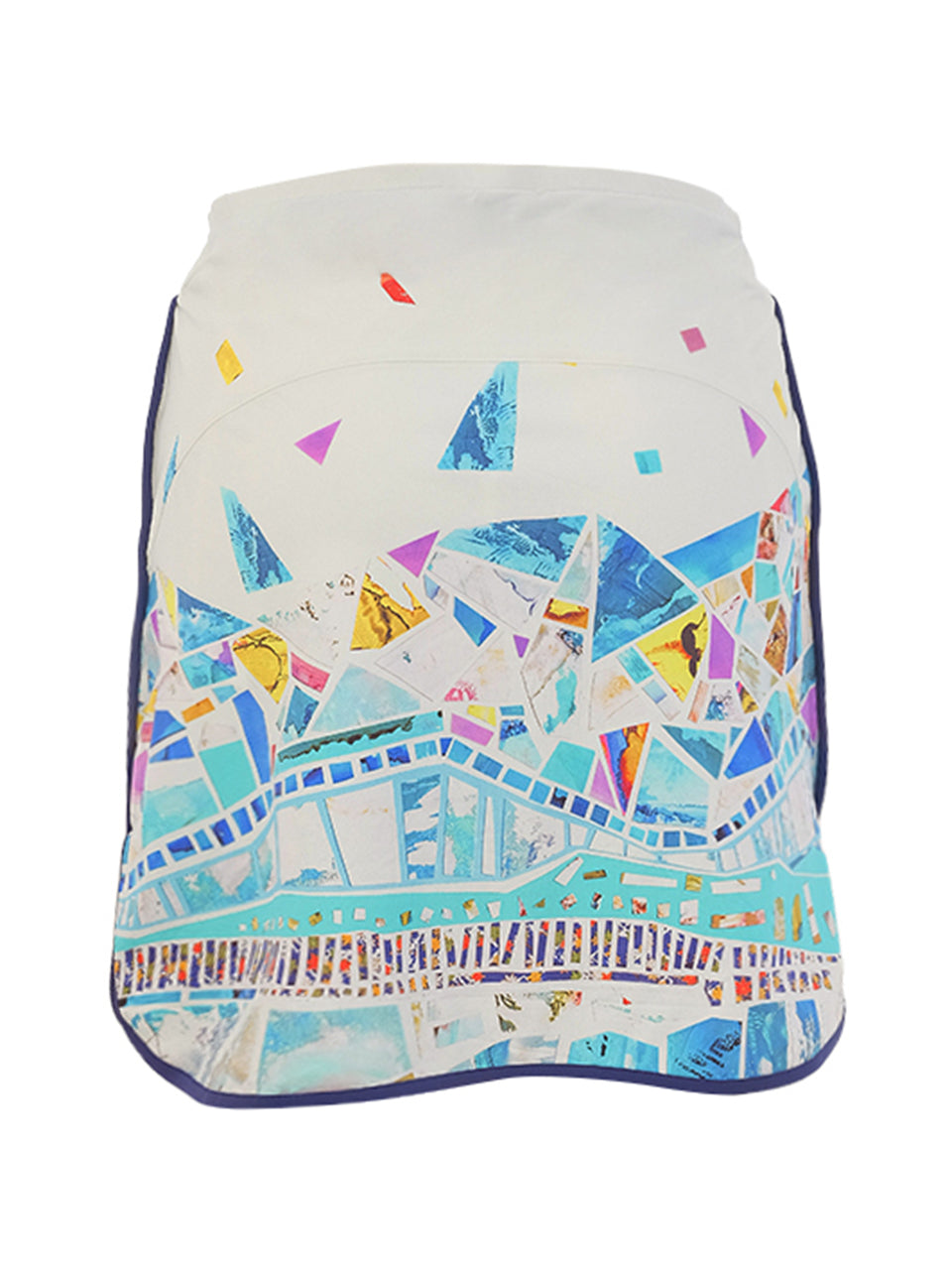 A vibrant pull-on skort inspired by the beauty of sea glass and colorful mosaic art. Featuring a lively collage of aqua, turquoise, coral, yellow, and soft pink fragments, the design creates a playful stained-glass effect against a fresh ivory background. Finished with sporty navy trim and an adjustable drawstring waist, this skort blends comfort, movement, and artistic style—perfect for the golf course or sunny resort days. 🌊