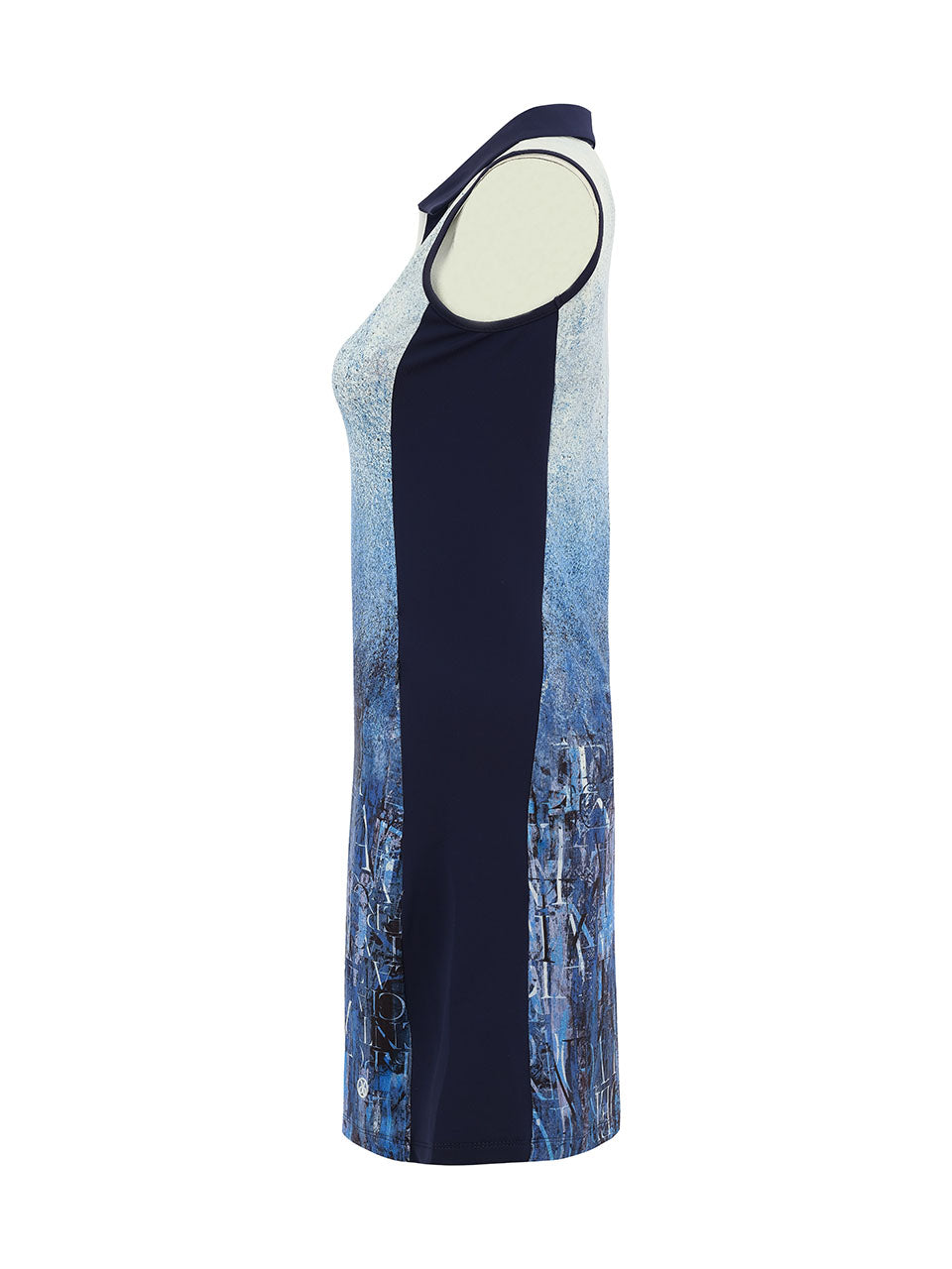 A vibrant sleeveless golf dress featuring a striking abstract mosaic print in refreshing shades of turquoise, aqua, blue, and soft accents of coral and yellow. Designed with a sleek stand collar and sporty half-zip neckline, it offers a flattering silhouette and comfortable stretch for easy movement on the course. Stylish and energetic, this dress blends athletic performance with bold artistic flair for sunny days on the green. ⛳️