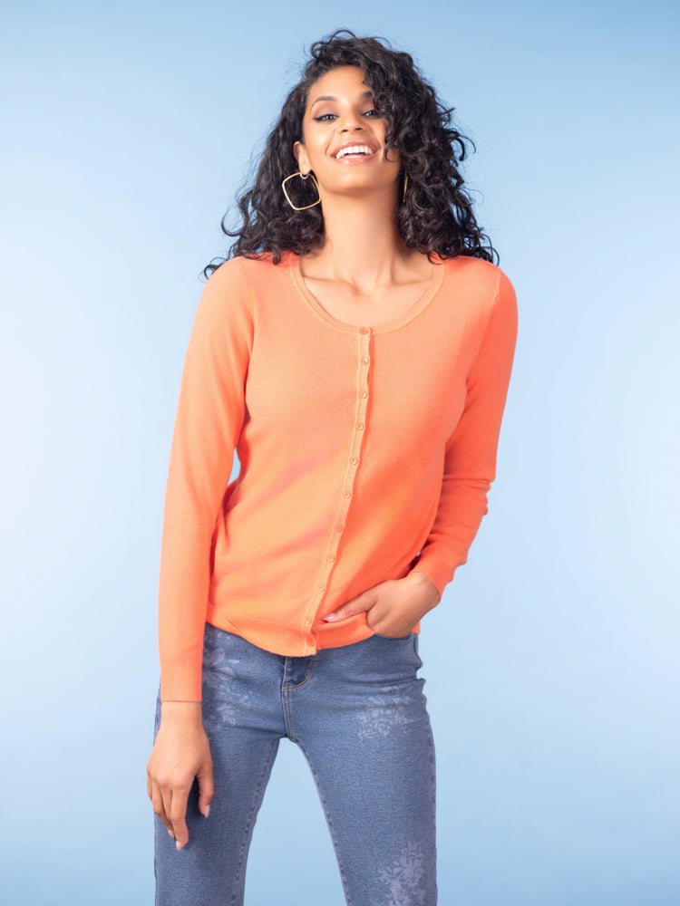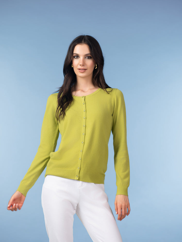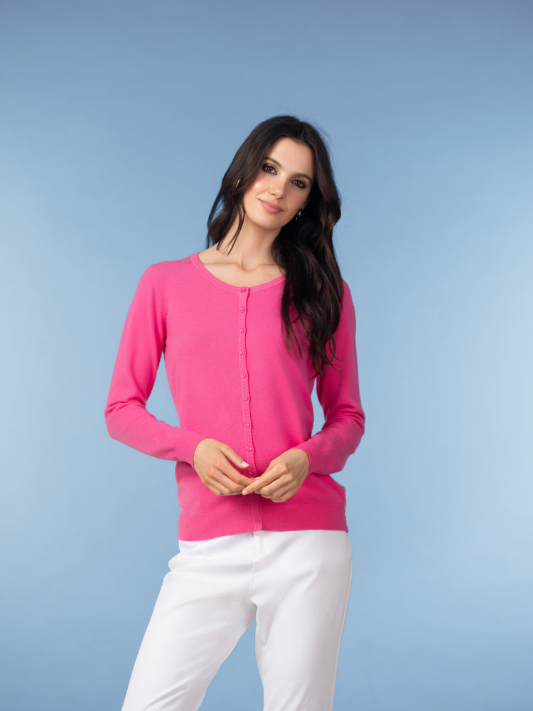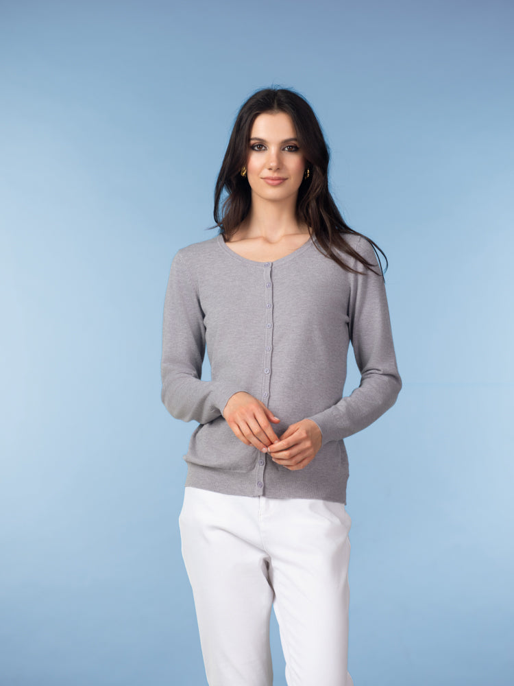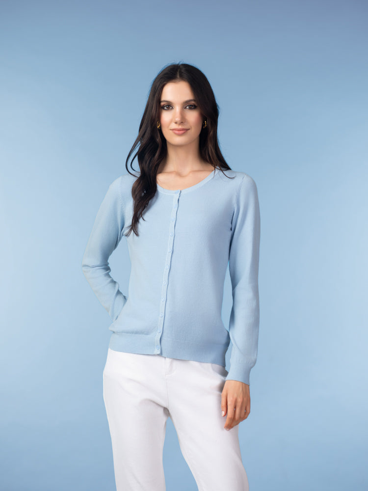 A timeless layering piece with a fresh, modern feel. This essential cardigan features a classic crew neckline and a full button-front design, creating a clean and versatile silhouette that works year-round. The lightweight knit offers a soft, smooth feel and a flattering fit that’s perfect worn on its own or layered over your favorite tops.