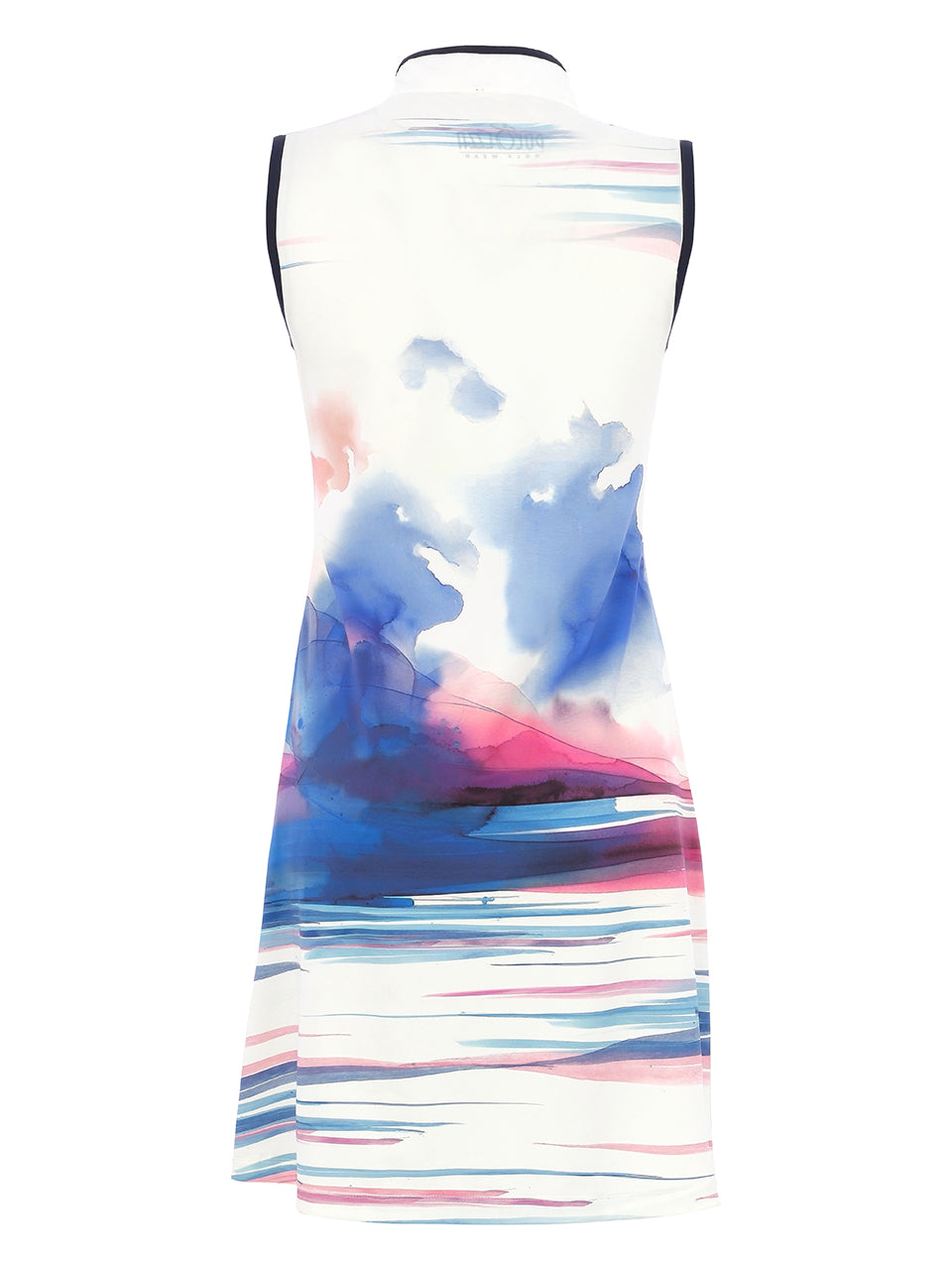 Make a statement on and off the course with this striking golf dress featuring an artistic watercolor print. Designed with a flattering sleeveless silhouette and a sporty zip neckline, it offers both elegance and performance. The lightweight stretch fabric allows for easy movement, while the vibrant golfer-inspired artwork adds a modern, expressive touch. Perfect for sunny days on the fairway or relaxed clubhouse style.