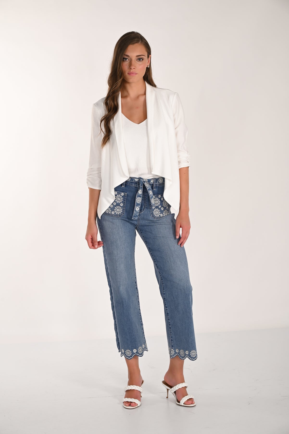 A straight-leg cropped jean with delicate floral embroidery on the pockets and hem. The tie belt adds a flattering touch at the waist, while the scalloped edge detail gives it a soft, feminine finish. Easy to dress up or down for everyday wear.