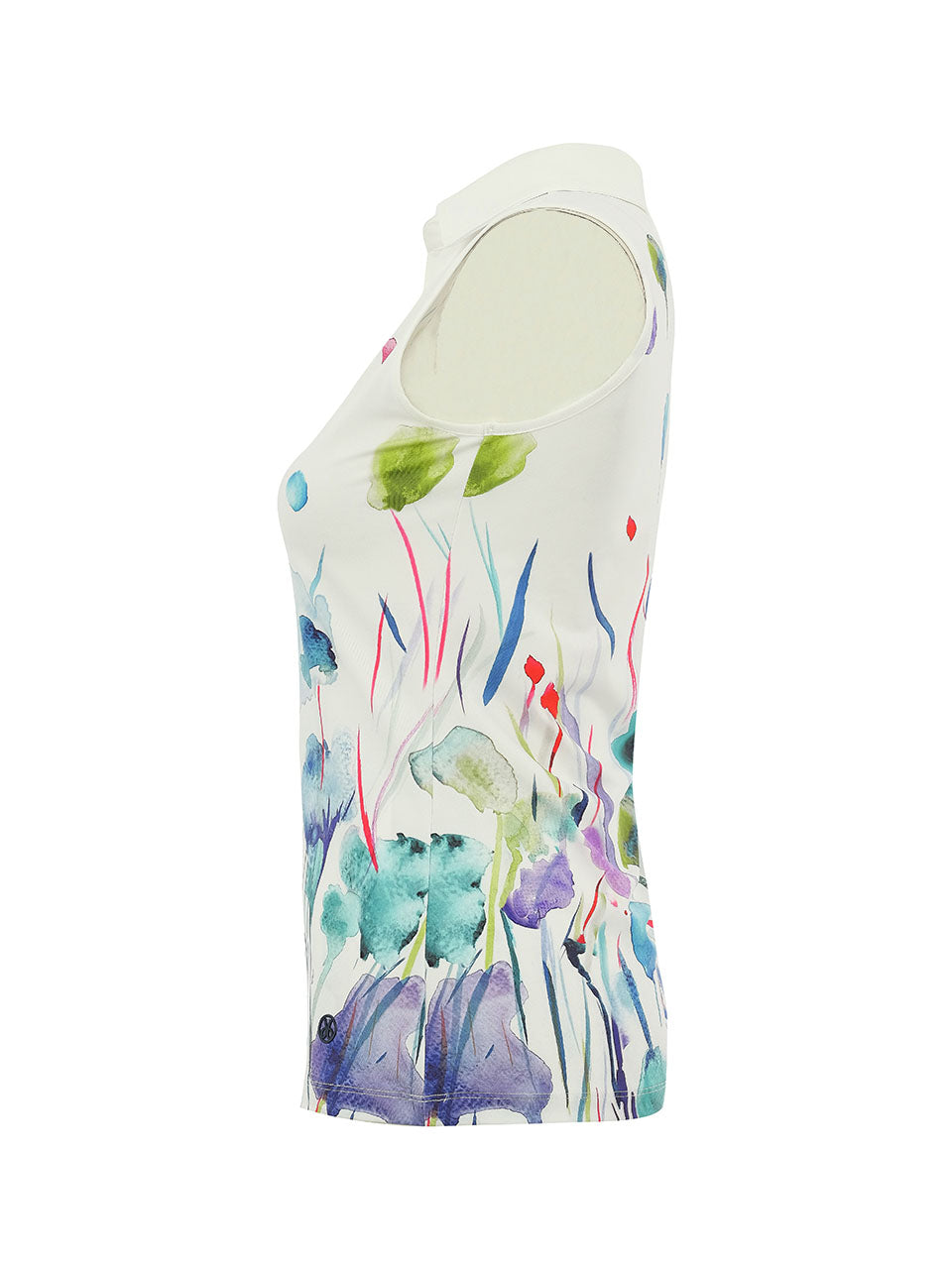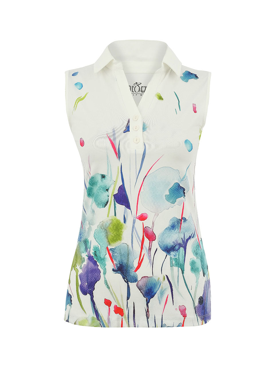 A graceful sleeveless polo that blends sporty elegance with artistic charm. Featuring a soft watercolor floral print inspired by a blooming meadow, this lightweight top brings color and movement to your look. The crisp collar and button placket add a polished touch, while the stretch fabric offers breathable comfort and freedom of movement—perfect for warm days on the course or effortless resort style.
