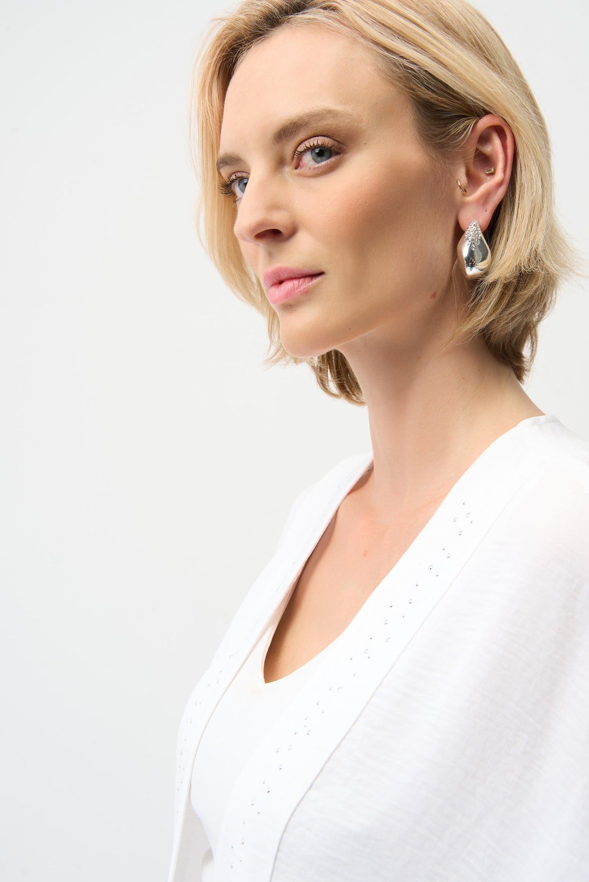 • Open front neckline with jeweled placket