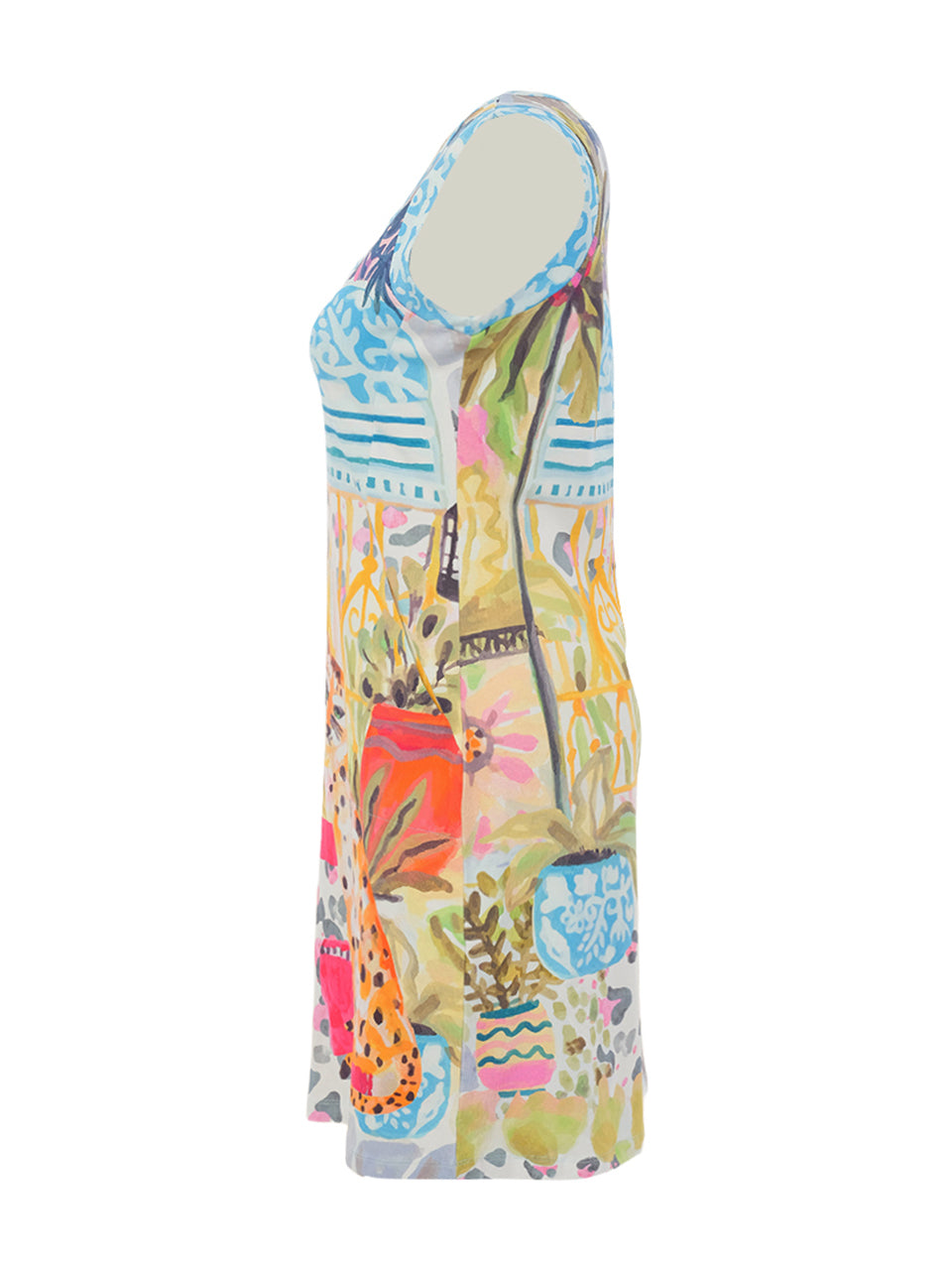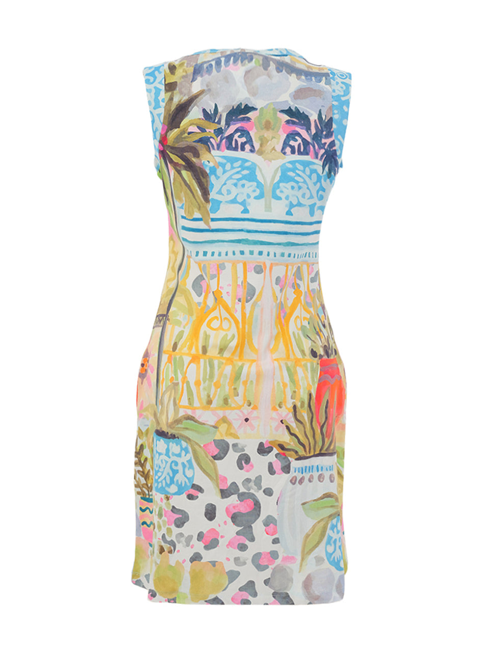 Bold, artistic, and full of personality, this sleeveless dress features a vibrant patchwork-inspired print blending tropical motifs, abstract patterns, and lively color accents. Designed with a flattering V-neckline and a softly defined empire waist, it creates a feminine silhouette that flows effortlessly to the knee. Lightweight and breathable, this statement piece is perfect for sunny getaways, summer lunches, or adding a creative touch to your everyday wardrobe.