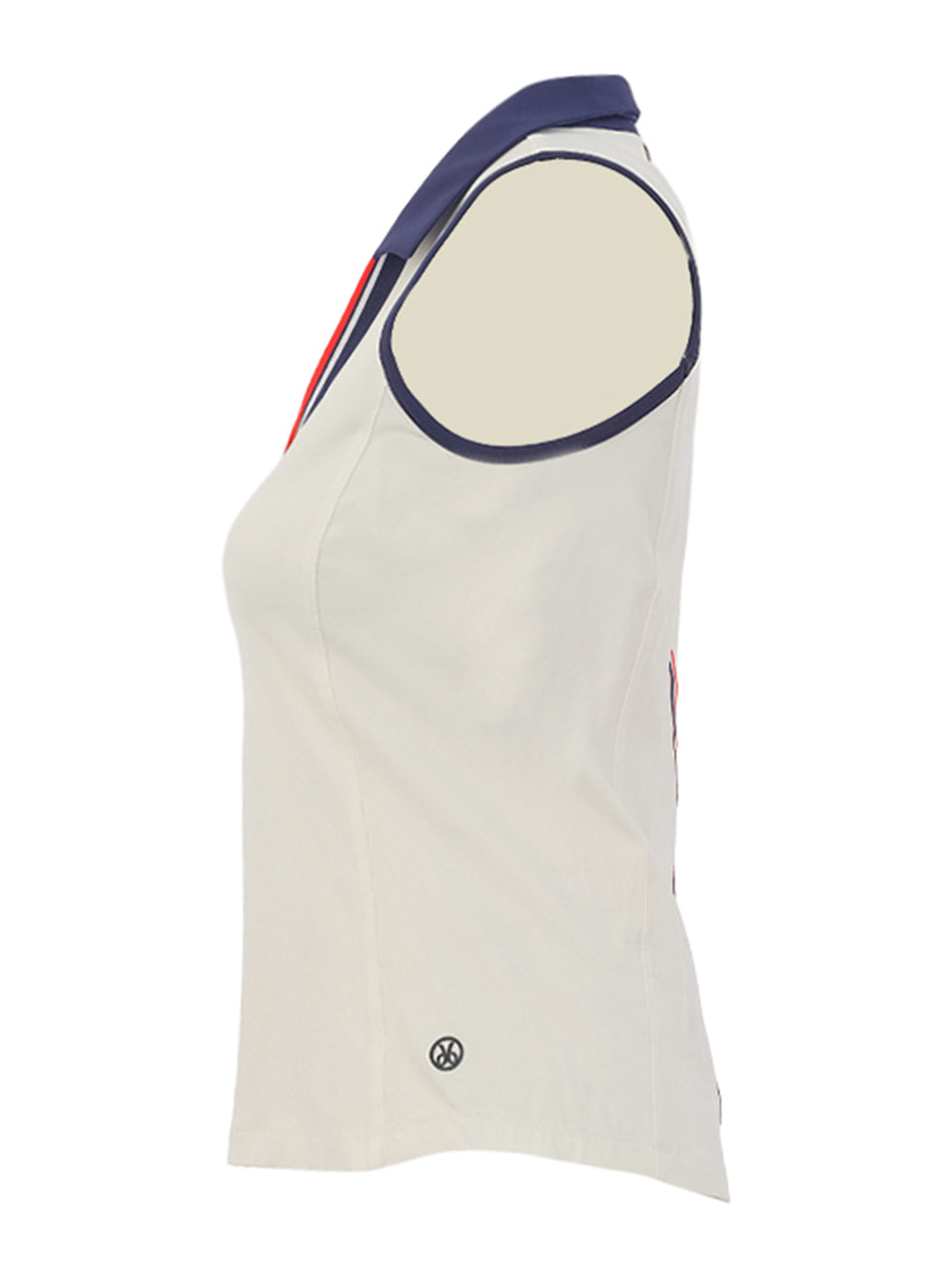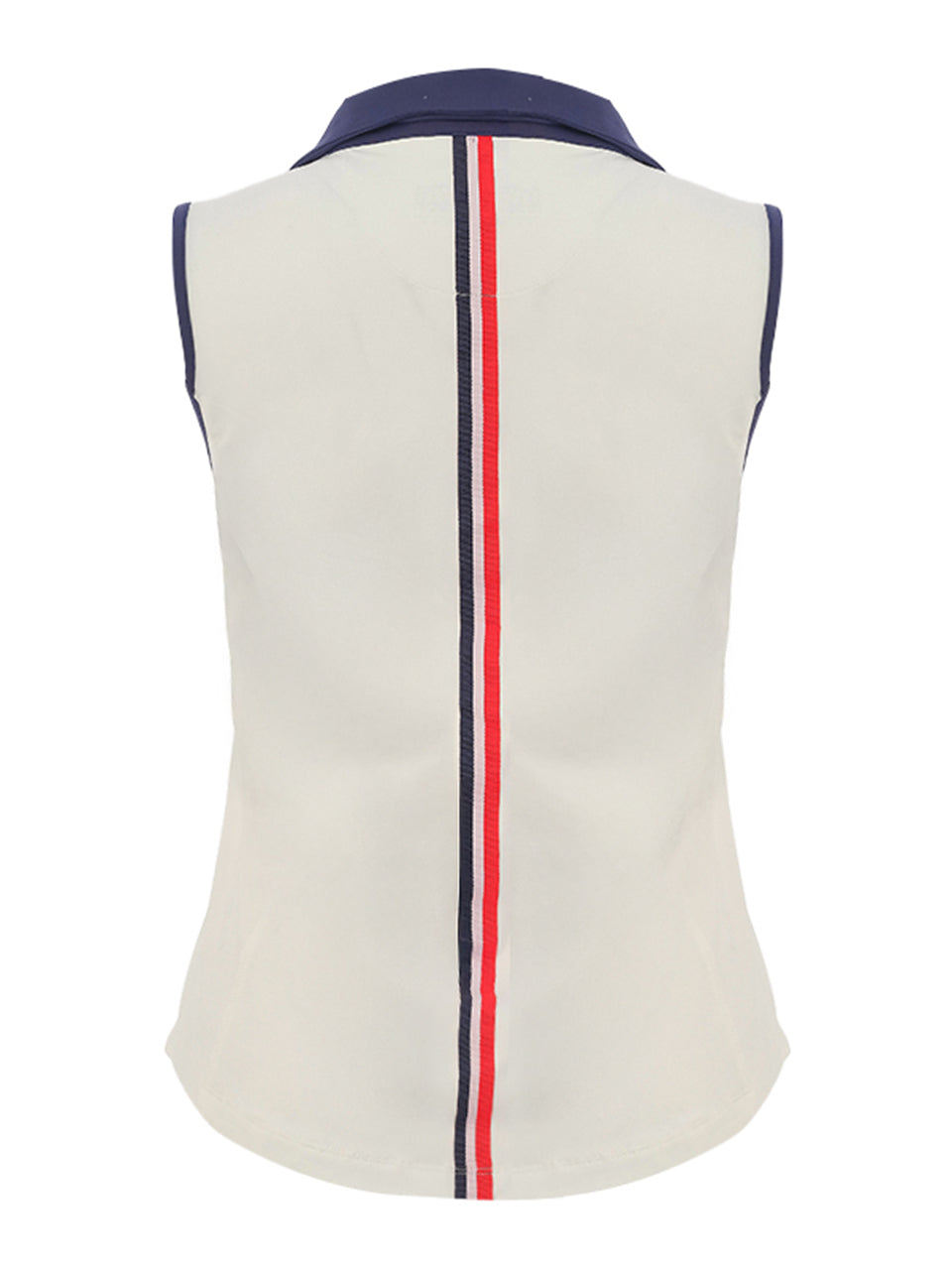 A sleek sleeveless polo designed with a sporty, modern edge. The crisp ivory body is accented with navy trim and bold red-and-navy stripe detailing along the back for a striking athletic look. Featuring a classic collar and flattering tailored fit, this lightweight performance top delivers comfort, stretch, and effortless style—perfect for the golf course or casual summer wear. ⛳️