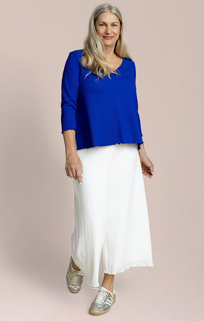 Fresh and effortlessly polished, this relaxed-fit top is designed for easy, everyday elegance. Crafted from a soft, lightweight knit, it features a flattering V-Neck neckline and three-quarter sleeves for versatile wear. The clean silhouette drapes smoothly over the body, while the subtle texture at the hem adds a touch of interest. Perfect for pairing with skirts, trousers, or denim, this top brings a refined yet comfortable feel to any look.