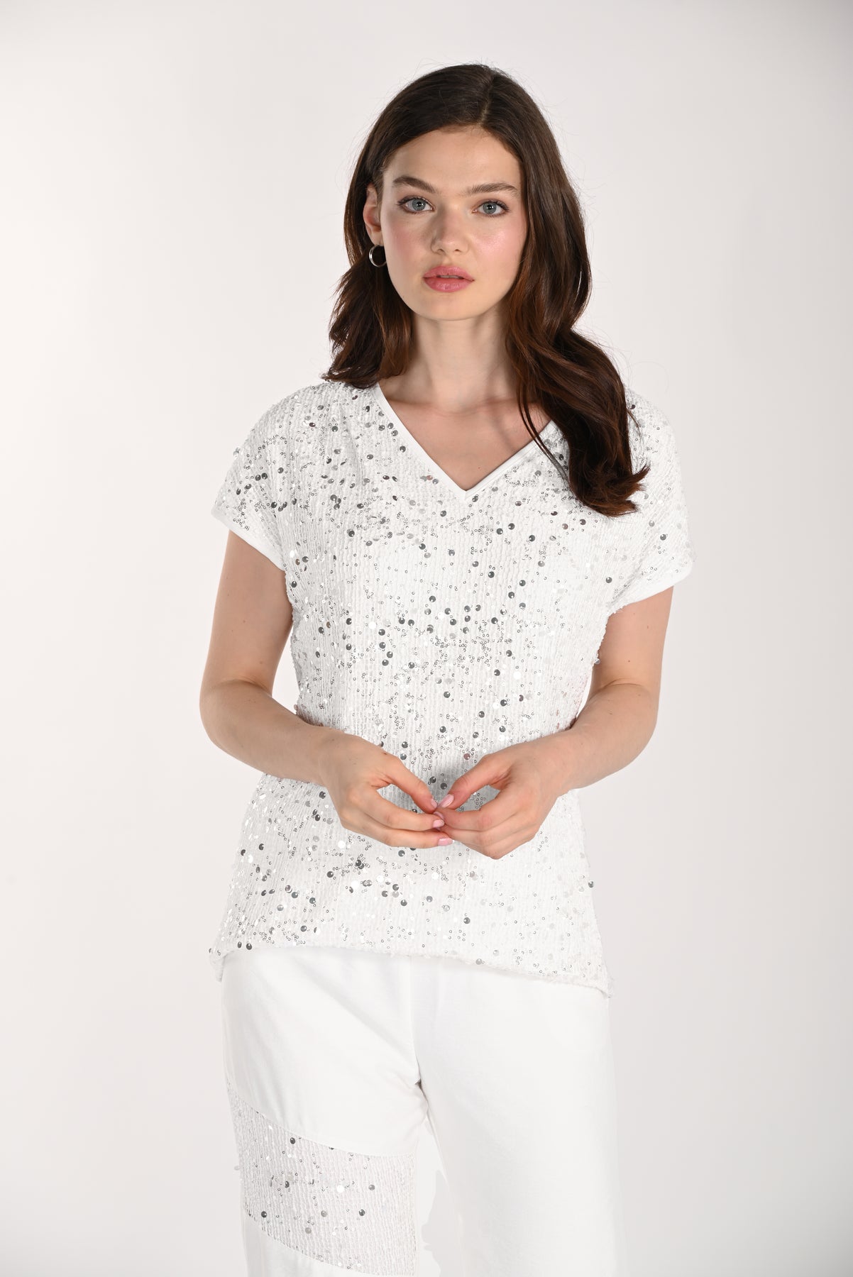 An easy, relaxed set featuring a V-neck sequin top paired with soft pull-on pants. Designed for comfort with a touch of sparkle, it offers a laid-back yet polished look. Perfect for casual outings or vacation wear.
