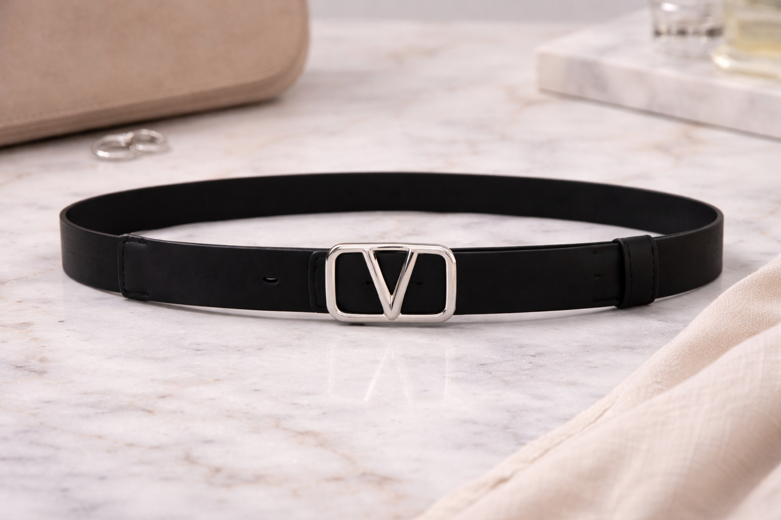 A sleek, minimalist belt designed with a smooth finish and a refined gold-tone “V” buckle for a modern statement. The slim silhouette offers versatile styling, perfect for defining the waist or elevating everyday looks. Effortlessly polished, this piece adds a touch of understated luxury to any outfit.