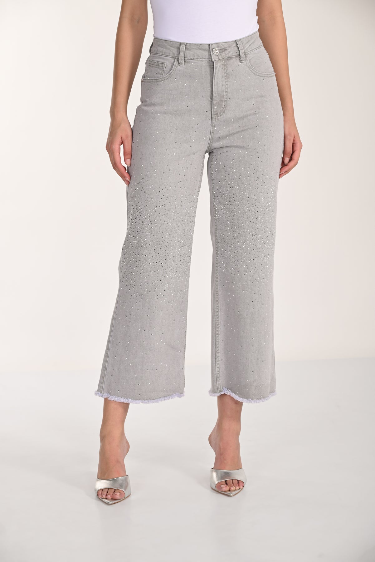Sparkle-embellished wide-leg crop jeans that transition seamlessly from day to night. The soft wash pairs with crystal details for subtle shimmer, while the high-rise fit and structured waistband deliver a sleek silhouette. Frayed hem adds just the right amount of edge. Style with heels for elevated looks or sneakers for effortless cool—versatility that works harder than ordinary denim.