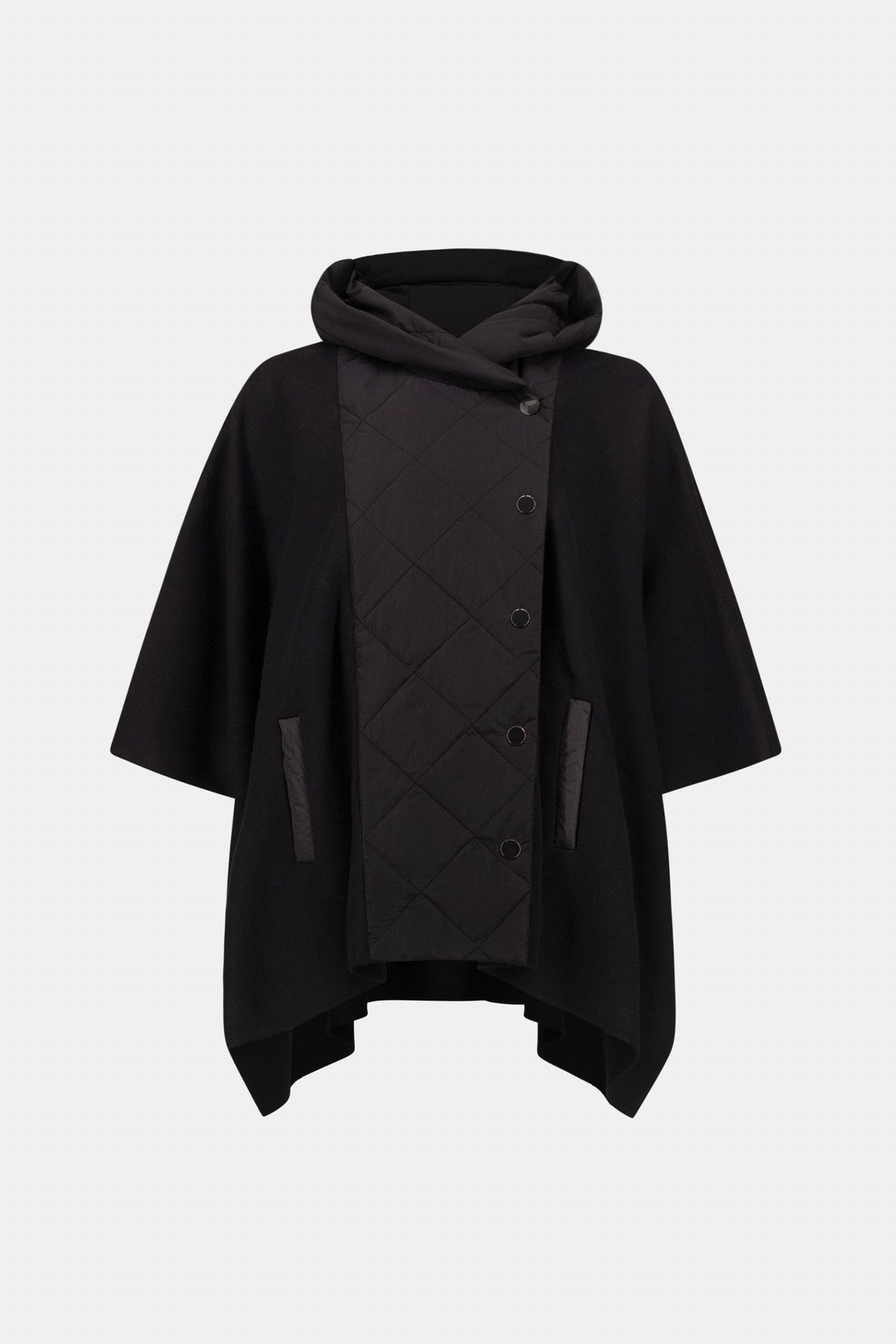 Blending soft knit with quilted panels, this boxy jacket offers a modern layered style. It features three-quarter sleeves, a hood, snap-front closure, and welt pockets for a functional, polished finish.