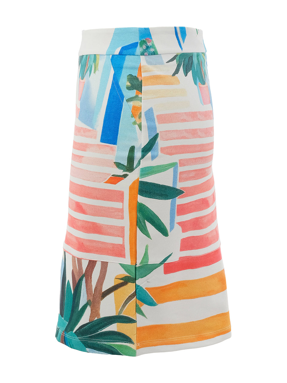 This pull-on skirt features an artistic patchwork print inspired by sunlit terraces and coastal scenery. Designed with a clean straight silhouette and a smooth waistband, it offers a polished yet easy fit. The vibrant mix of stripes, botanicals, and color blocks adds a fresh, modern touch—perfect for warm-weather styling from day to evening.